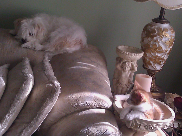 The picture shows shows our Labrador Retriever, Mica, and our Yorkshire Terrier, Bailey, sleeping on our favorite couch, with some winter sun filtering in to warm them. Bailey likes to climb up and nap on top of Mica. This was not a posed photo.