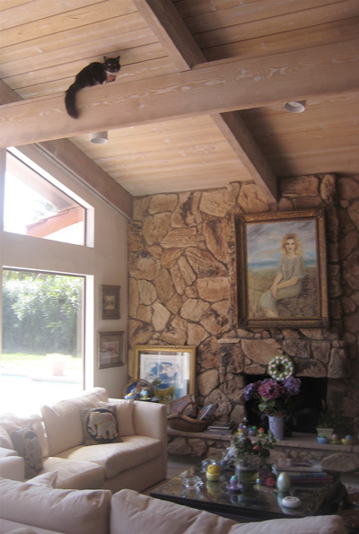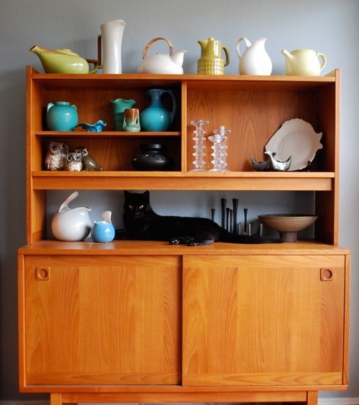 Here is my cat Harris lounging on my Danish hutch that I found at the Salvation Army amongst my mid-century ceramics collection. Luckily he isn’t really able to knock anything over since it is all earthquake puttied down.