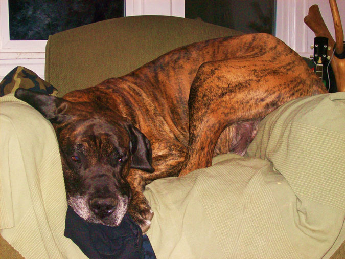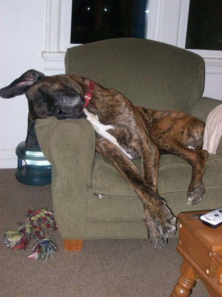 His name is Odin, a Great Dane/Saint Bernard this is his favorite spot to nap. To give you an idea of how big he is: I am 5’4″ and I can curl up in that chair!