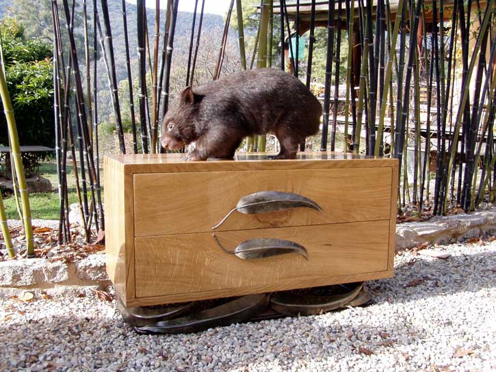 Although she isn’t technically a ‘pet’, this is Olive an orphaned wombat which my parents hand-reared and released into the wild at their Farm in North-east Victoria. Here, Olive is pictured on one of the furniture pieces designed and crafted by my father.