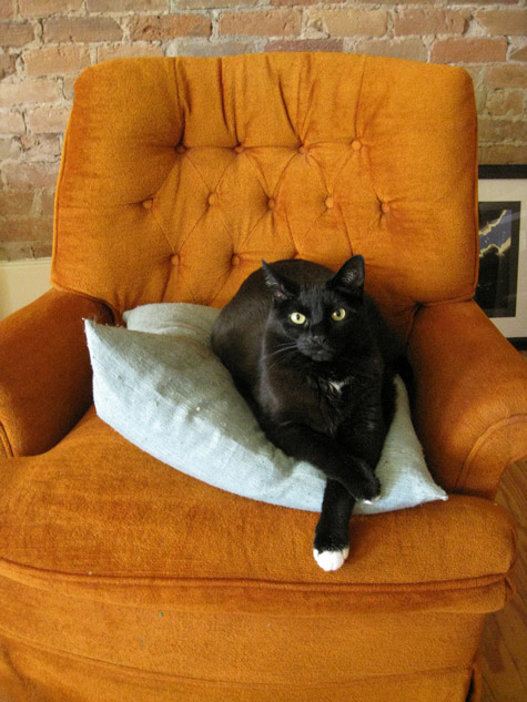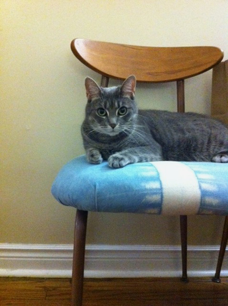 This is my foster cat, Blossom. She’s sitting on a chair I reupholstered with hand-dyed fabric. Blossom is up for adoption (details HERE), and I hope she finds a forever home with lots of comfy chairs.