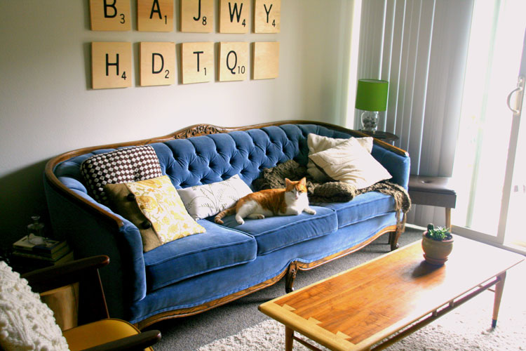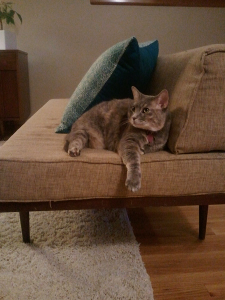We just got a new couch – antique, blue velvet… yum. Our cat, Maggie, clearly approves of our choice!