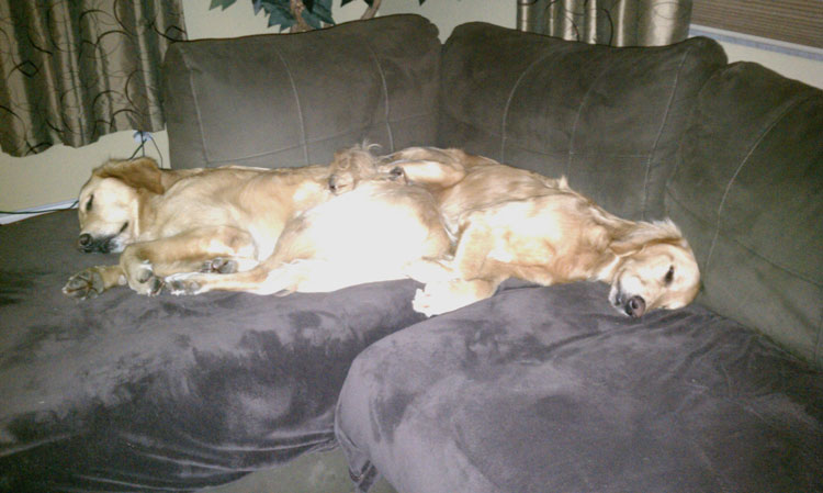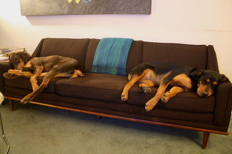 Here are our two sacked out dogs, Daniel Louis and Kayla Rae Sunshine, leaving no room for the people that own this couch. They do this quite often. We found the couch with terrific Mid-century bones at a local thrift store and had it re-cushioned and upholstered.