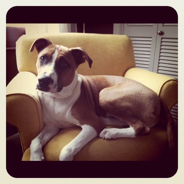 This is my baby Stella sittting on my favorite chair from Goodwill. 🙂