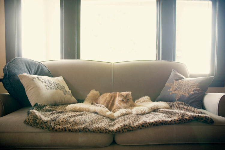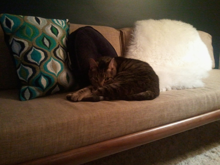 I snapped this recently of our cat, Smokey, enjoying a few minutes of peace on our couch. Our daughter was born 7 weeks ago, so life in our house has been a bit crazy! Smokey didn’t really appreciate my interrupting her nap but I couldn’t help it 🙂