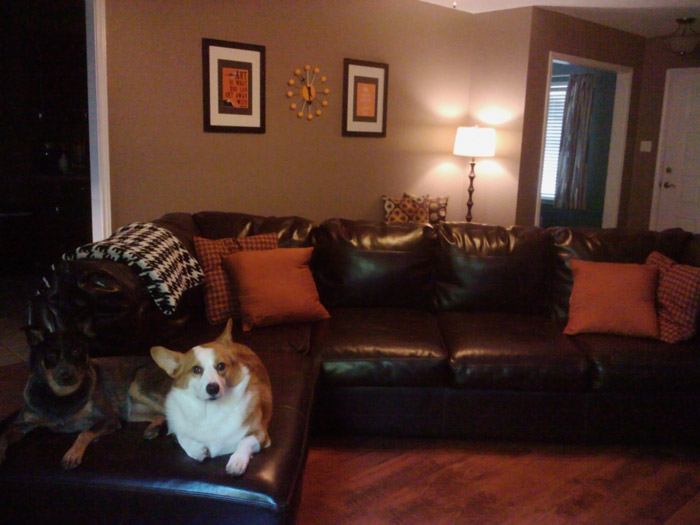 Excuse the blurry camera phone photos; Farlee the 1-year-old Blue Heeler and Duke the 5-year-old Corgi won’t allow me to venture into the next room to grab the real camera… they follow my husband & I everywhere! Here they are on the genuine leather “dog bead” that we bought for our first wedding anniversary last year. They have broken in the leather very well & I know our comfy couch will hold up great once our first 2-legged offspring arrives in February!