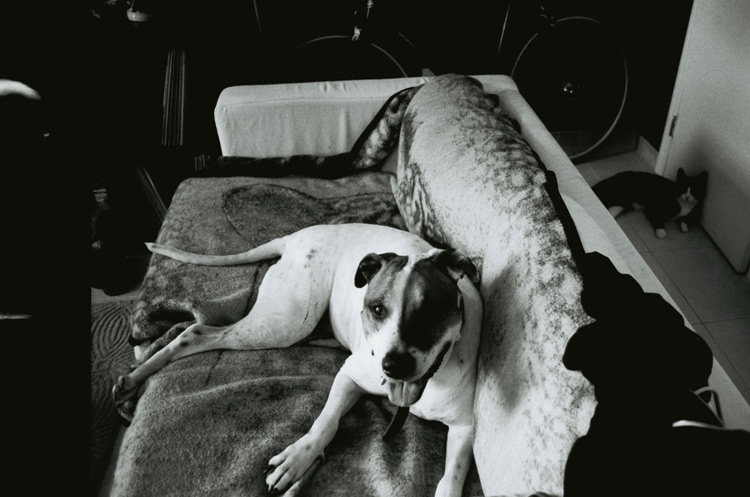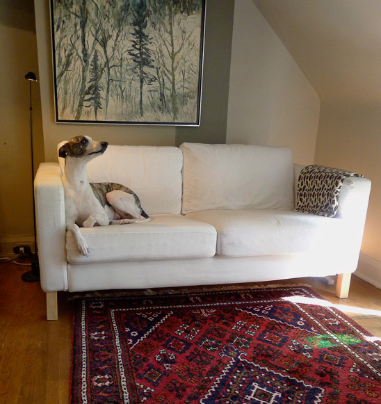 Here’s a shot of Whippet Shanti reclining on Dennis Battler’s loveseat in Toronto, an outtake from a mini house tour.