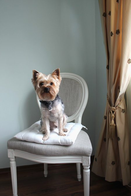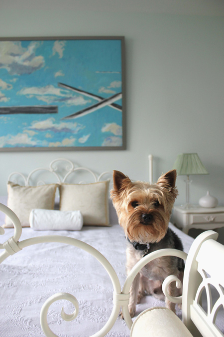 This is my 3 years old Yorkshire terrier Frodo siting at our bedroom’s Luis inspired chair and on our bed. I am an artist, so you can see one of my blue sky series paintings hangs on bedroom’s wall.