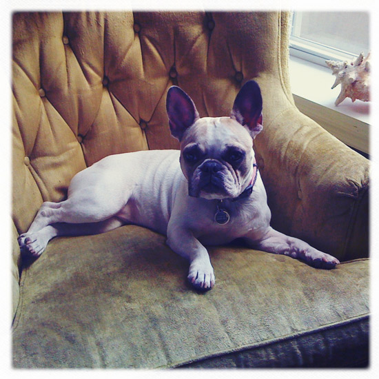 This is my dear French bulldog/shih tzu mix, Bo. She sits in her favourite corner of our well loved, down-stuffed leather sofa. Inevitably the pillows she is perched on are dramatically shoved off moments after she jumps up to rest her nearly hairless belly on the cool leather! For such a silly little dog, she certainly looks serious in this picture.