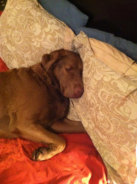 While commuting to work this morning I received this photo of our 2 year old Chessie, Gus… and I ABSOLUTELY agree with his attitude about Mondays!! (of course taking full advantage of a recently made bed as well)