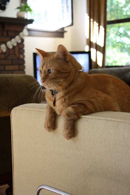 “Here’s my buddy, on top of the couch. I had stripped it to clean the slipcovers. It was two pile high with cushions. And he managed his way to the top.”