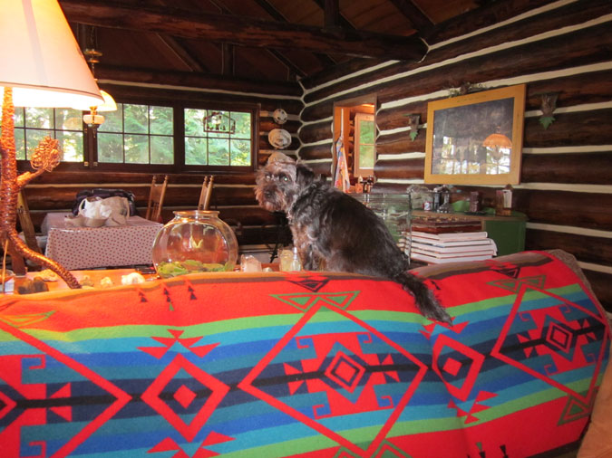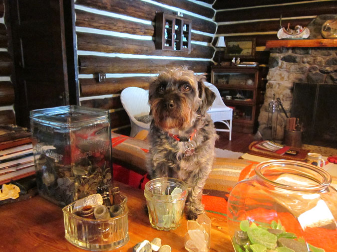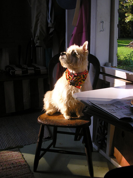 “My sister’s family dog, Harry Potter Grey, enjoying the morning sun at our cottage on the U.S. side of Lake Erie. Junk shop chair & Ikea shelf. Halloween bandanna from the groomer….”