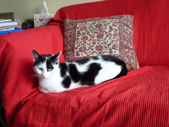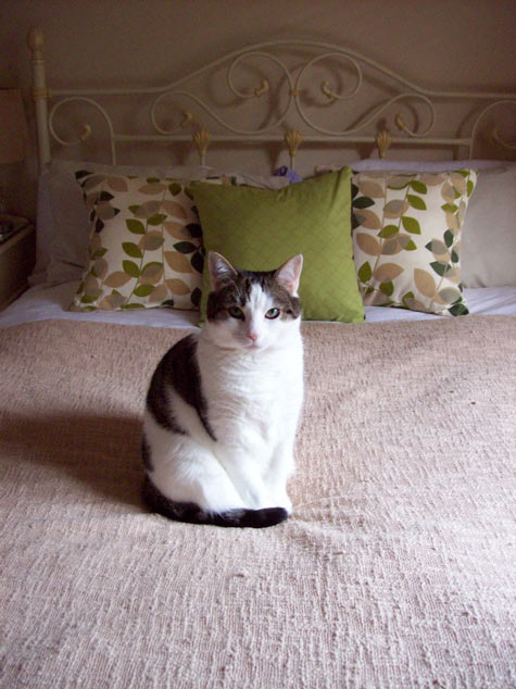 “Here is a picture of our youngest cat, Muffin. She is sitting in the middle of my bed, in front of my favourite leafy cushions. 🙂”