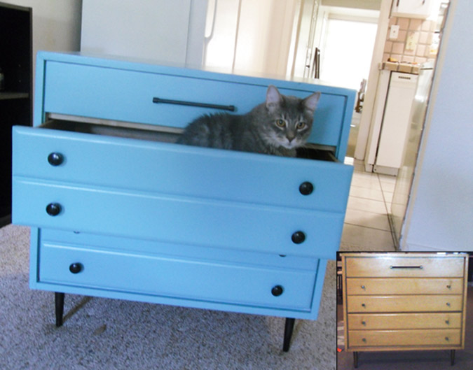 “This is my Maine Coon mix Fritz who apparently loves my vintage 1950’s refinished dresser as much as I do. I can’t keep him out of it long enough to load it up! The before picture is in the bottom right corner.”