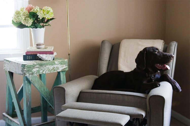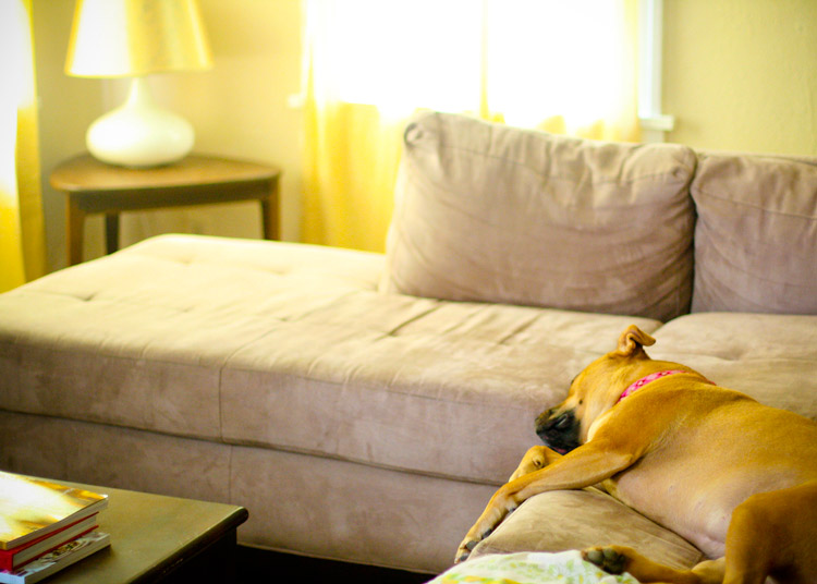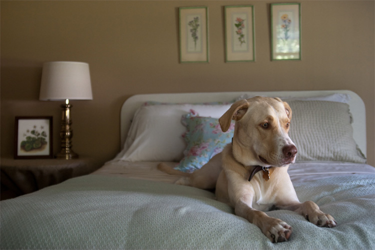 “Austin, our blond rescue Lab mix, really likes to nap on our soft furniture. I find tell-tale “Austin hair” on the leather couch, sitting on which is a big no-no, and rumpled blankets on the guest bed, pictured.