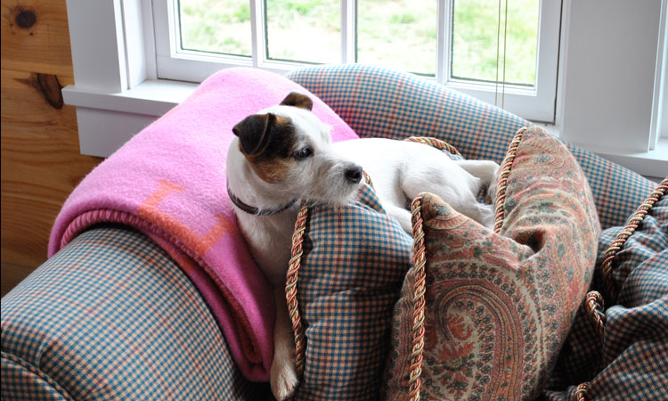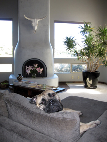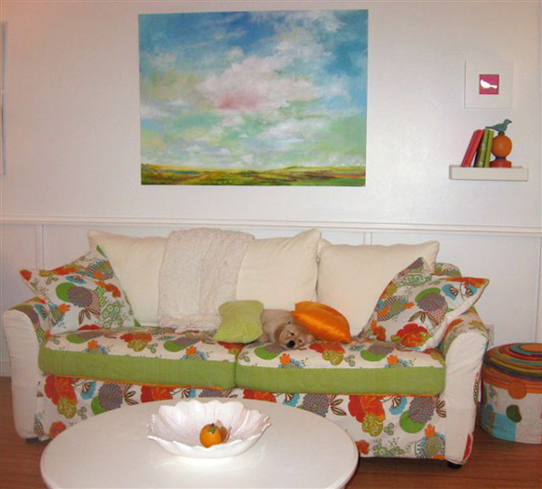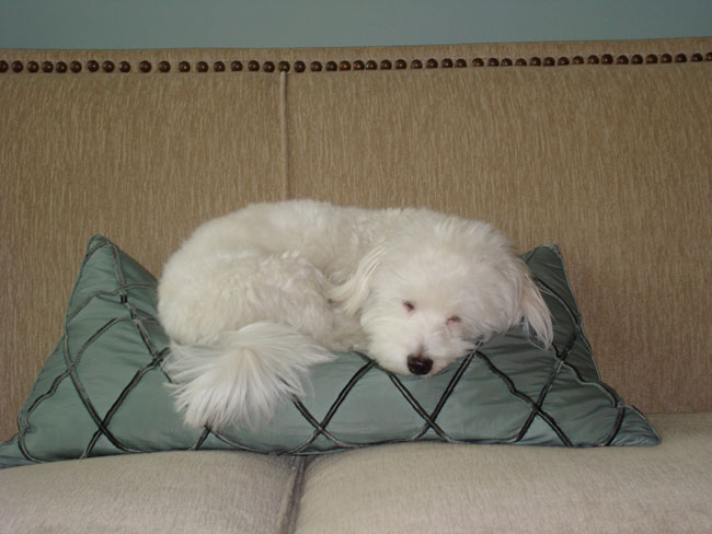 “Our boys and girl enjoy their lounging time on a resurrected sleeper sofa… I made the linen slipcover to ease clean up of puppy prints and any body fluids which might escape.