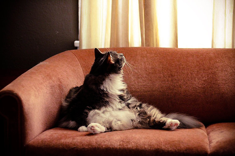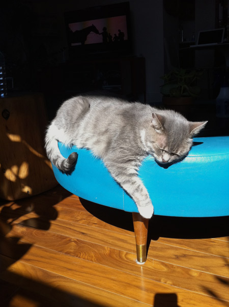 “This is Stella sunbathing on our mid-century modern ottoman (the ottoman was my grandmothers and I used to take naps on it as a kid, a tradition she now keeps alive) I also like to think she has good taste in furniture.”