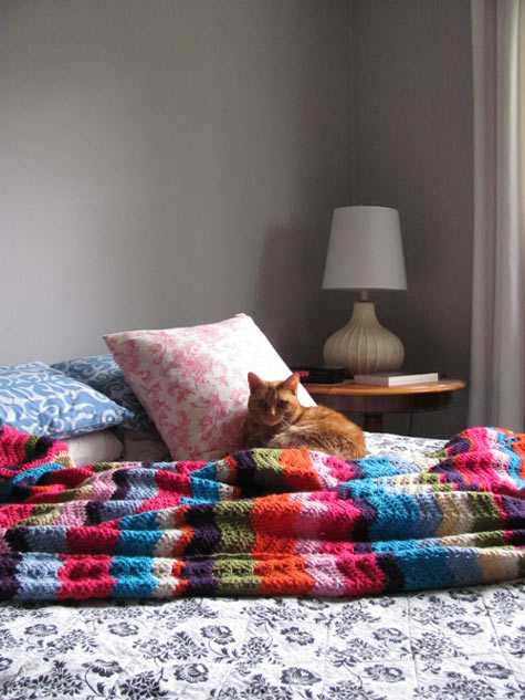 “This is my foster cat, Trixie, a truly lovely pet, whom I hope found a loving family when she got back to the DSPCA (Dublin Society for the Prevention of Cruelty to Animals). The plaid is from Ikea and the Indian cushion cover comes from the Camden Market in London, bought 14 years ago but still showing vibrant colours.”