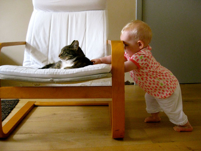 “The pet is our cat called Taxi and the piece of furniture is my cheap white Ikea-seat that I have for more than ten years now. The kid is our daughter, Esmée. This picture is taken in July 2009, a few days before her first birthday. Although this scene suggests otherwise, Taxi and Esmée get along fine.”