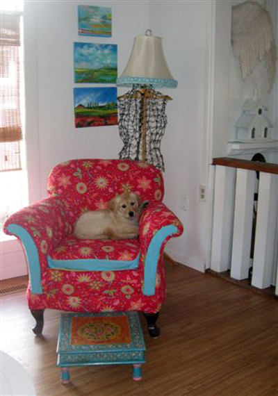 Miss Bee enjoying an afternoon snooze on my flea market chair. I recovered the chair with a funky quilt.”