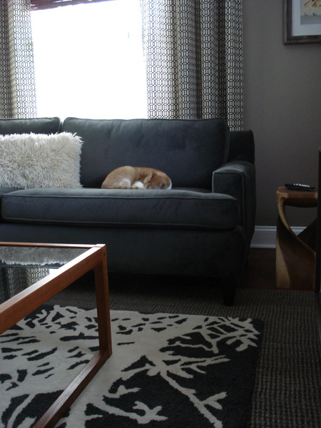 “Kitty loves to curl up for a nap or sit on the back of the sofa in our living room. We love the mid-century feel of this charcoal sofa – even if it doesn’t hide her hair all that much.”