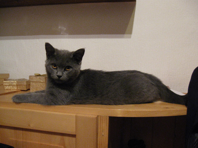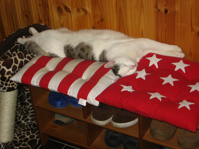 “I’d like to contribute a couple of photos of our Norwegian forest cat Kharma. Our Spanish leather dining chairs are perfectly curved to qualify as a favourite spot (contrary to most cats, Kharma is not too fond of soft furnishings…). If our outdoors roof staircase can count as ‘furniture’, that’s another favourite…”