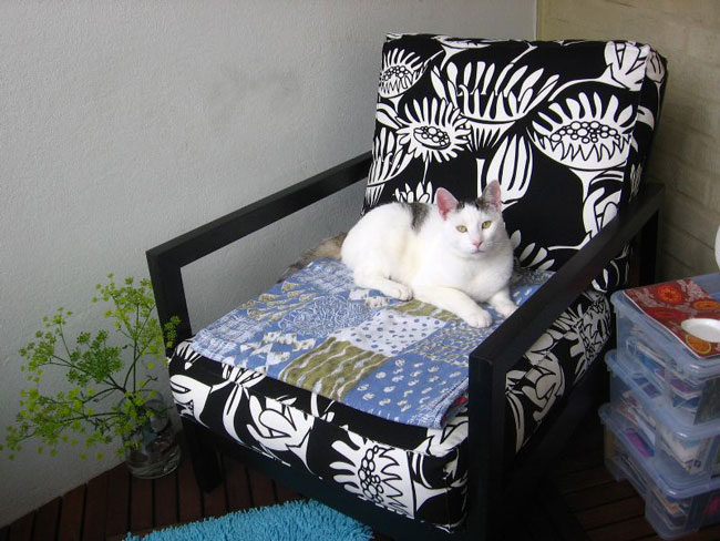 “I have gone back so many times to your sofa that you built yourself, and have kept saying to myself “I can do that”. I’ve been searching forever for the perfect sleeper sofa with no luck. Mine is nothing like yours, to be honest, but you insprired a fellow Ottawan to give it a shot. I found fabric that I couldn’t pass up and just had to do SOMETHING with, and I came back your post again. It’s finally finished and being lived on by my cat Doug.”
