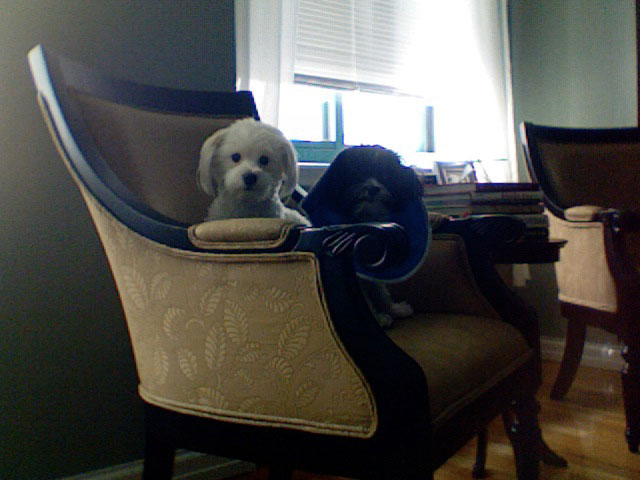 Amos is the baby, a 9-month old chocolate Lab mix. He finds all sorts or places to sit so he can watch the birdies outside, like my reading nook chair.”