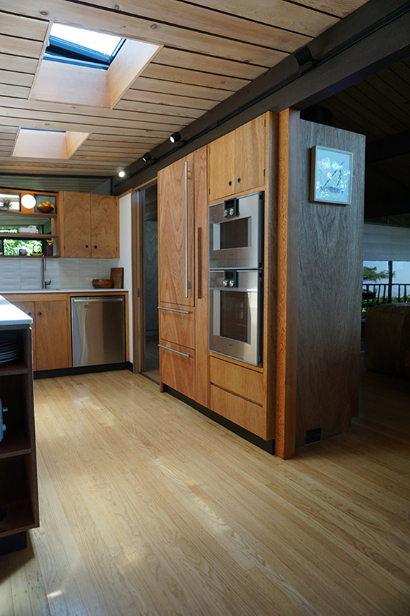Back in 2012 Christa submitted this entry for our Design Crew series. She was wondering what to do with her Honduras mahogany kitchen cabinets that were in rough shape. We were excited to hear from her the other day that she did a mini renovation of her kitchen and send along some before and after photos. It isn’t a dramatic transformation but I am glad because her cabinets are gorgeous and I think they’re beautiful left natural. Here is what Christa had to say about her new kitchen: I have made peace with all the wood in this house and decided to keep and refinish the original wood cabinets. They are a bit beat up but I like the patina and they’re solid wood and plywood, built to last. I decided that combining the old cabinets with some lux new appliances would balance out to something original and beautiful. I wanted the kitchen to feel fresh and bright but also timeless and appropriate to the house. I added 3 feet (a little less than a meter) of base cabinets matched to the existing ones (it was a rolling cart in the old kitchen). This gave me a lot more counter space along with shelves on the end for dog bowls and for small appliances so the countertops could stay clear. I took down an upper cabinet and built open shelves instead. I added a Heath tile backsplash, had the fridge integrated, and added a pull out pantry.