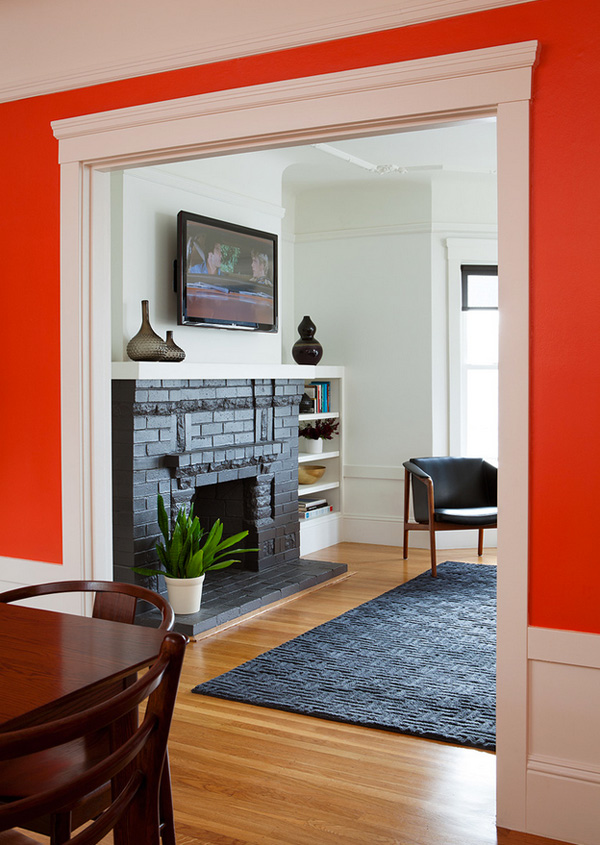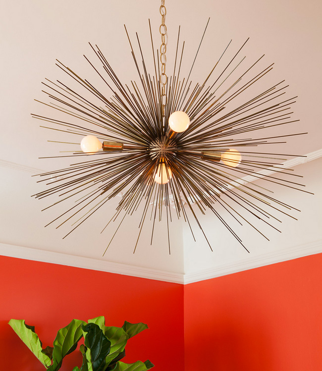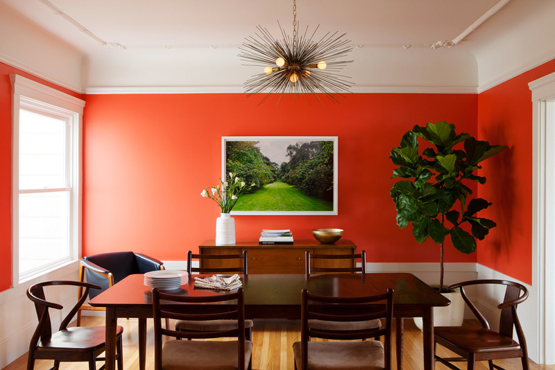 I dislike red in any application. This is the first time I have ever actually liked a red in an interior. Kudos to interior designer Christy Allen for finding this perfect shade – Benjamin Moore’s Soft Glow, a coral red with pink undertones. It’s stunning with the artwork and fiddle leaf fig tree.