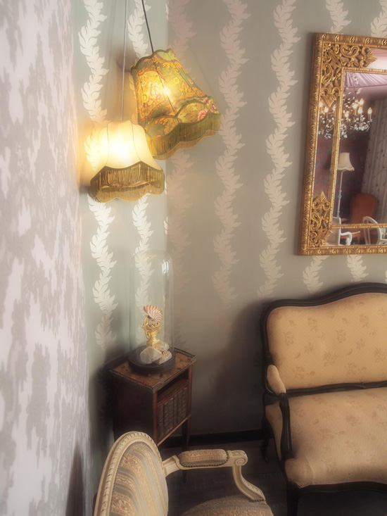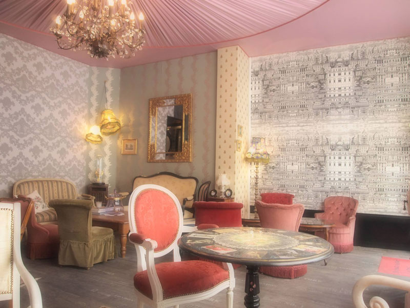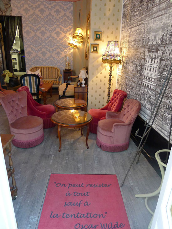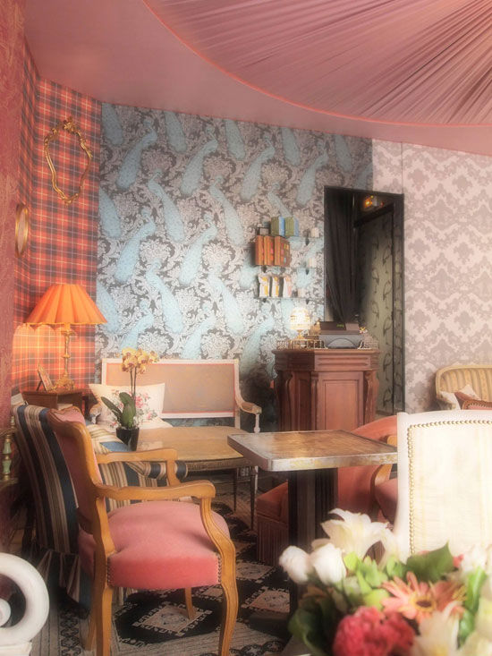 Laure, from this home tour, wrote the other day to let us know she recently designed a tearoom in her ‘hood of Le Cannet, France. I’m not a big tea drinker and have never been to an establishment to specifically drink tea and have cookies but I would totally get all dolled up to hang out at the Madeleine. It is SO CUTE – filled with all of granny’s miss-matched furniture and then modernized with a collage of wallpapers by Farrow & Ball, Cole and Son, Christian Lacroix, Fornasetti…