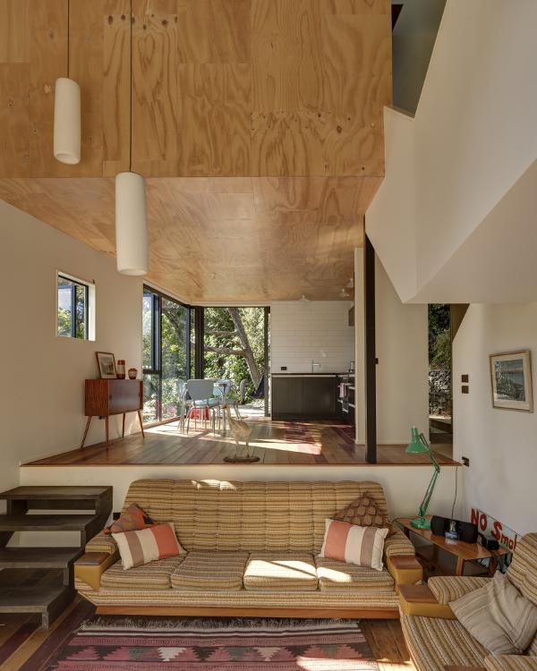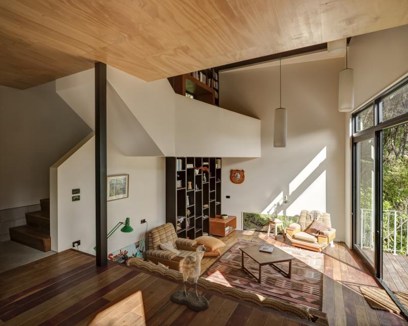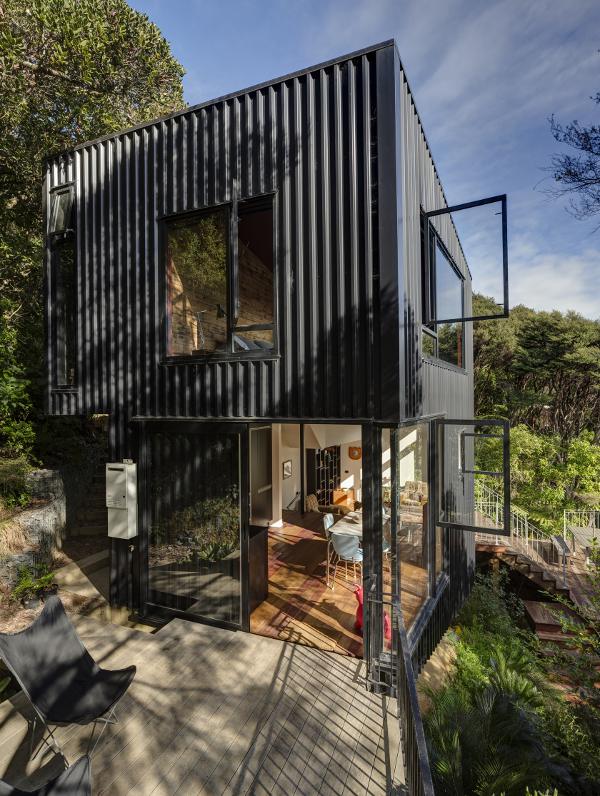 Rising like a dark tower through the dense vegetation is a modest one bedroom house. Changes of level and expanses of glass provide views that slice through the tree canopy while the house seems to tumble down the steep slope. Black cladding helps the structure disappear into the forest. A wonderful getaway, an adult’s cubby house. The Blackpool House at Waiheke, New Zealand by Glamuzina Paterson Architects.