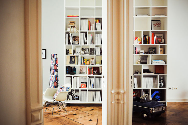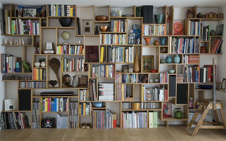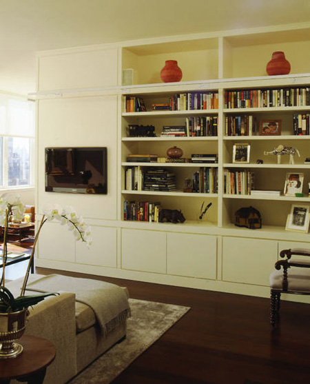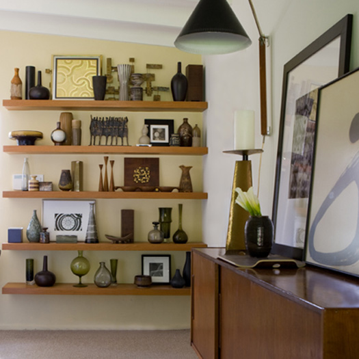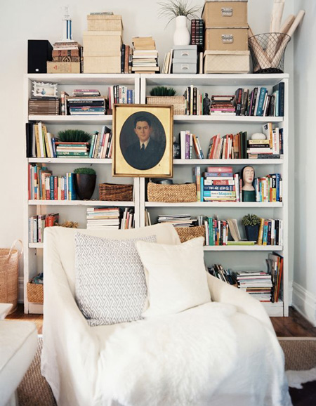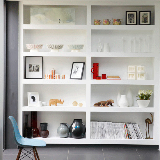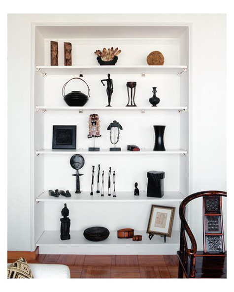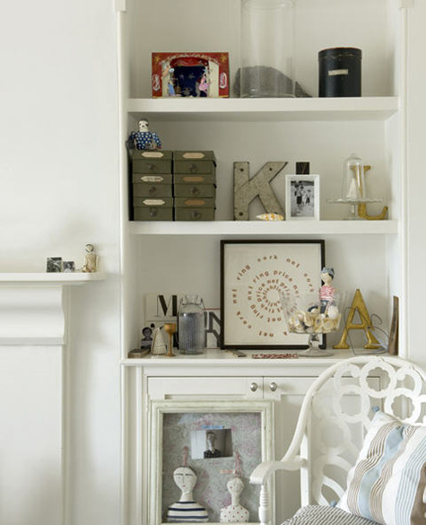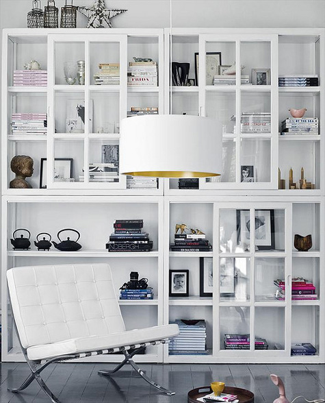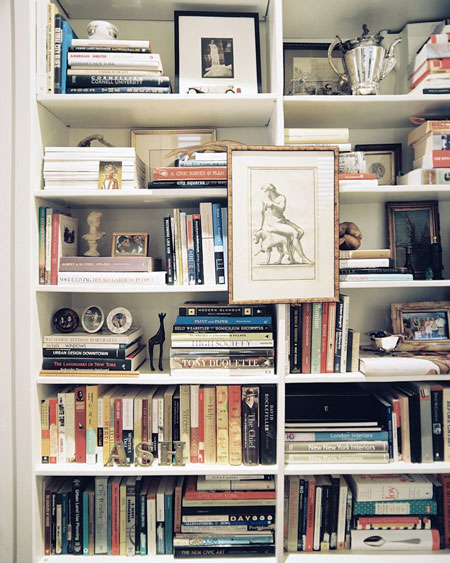 Today’s reader request is from Eva in Toronto: I was wondering if you could perhaps provide some inspiration on how to decorate and style some build-in units in a main living space? I would love to see how others around the world have filled these spaces with treasures/books/objects d’art so that I can do the same in my home. Simple enough request, but sometimes quite a daunting task to get vignettes looking just right. I constantly change items on display in my house as I am never happy with them and get bored quick. Observing how others display objects can help us rethink how our own pieces are used. For example, I have a bunch of spray painted black vases (leftover from my wedding) on some shelving, and I took a wide/short vase and stuck 2 skinny/tall vases in it. I have a stack of about 8 books on the same shelving, standing upright with the tallest at the back and shortest at the front that way you get a peek at the cover of each book (seen here). Hopefully the following group of photos help to inspire Eva’s built-in displays.