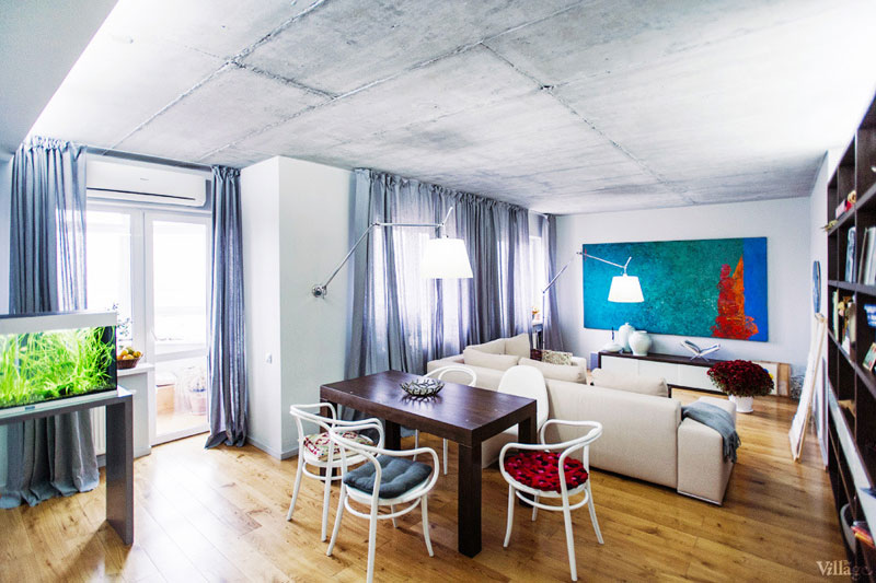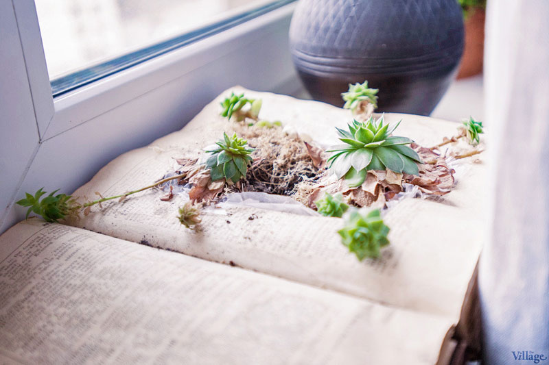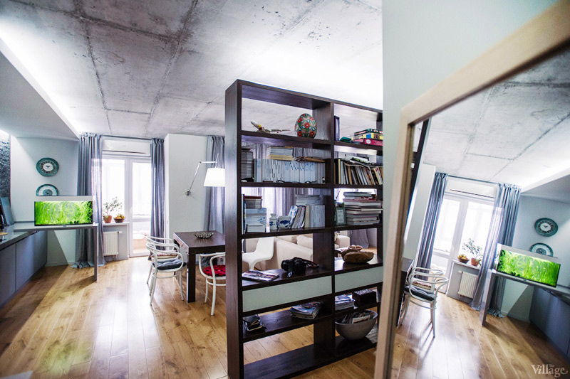 A couple of weeks ago I blogged this awesome apartment in Moscow. I’ve got another one for you from The Village, this time located in Kiev, Ukraine. It’s a small, 2 room apartment that looks so much larger (camera lens might have helped a bit too). This pad is a perfect example of how to place furniture in a small space and how to use furniture to delineate zones. The sectional sofa in this case is just what the living room needed to separate it from the dining space. The bookcases offer tons of storage and creates more of a hallway (while blocking a couple of not-so-exciting doors). I LOVE the grey colour palette (my favourite colour, always) and everything else in this apartment – but I’d lose the fish tank in the kitchen. Strange…but I won’t judge. The adorable succulent-in-a-book planter idea makes up for that oddity. (And I had to use that photo first so you all didn’t miss it).