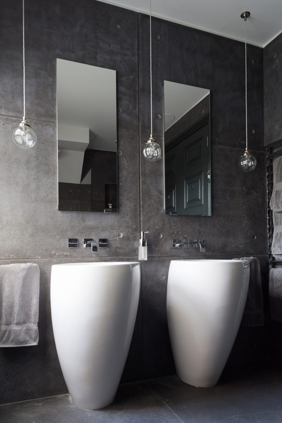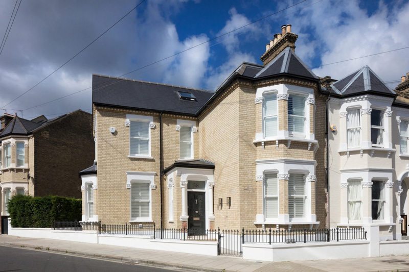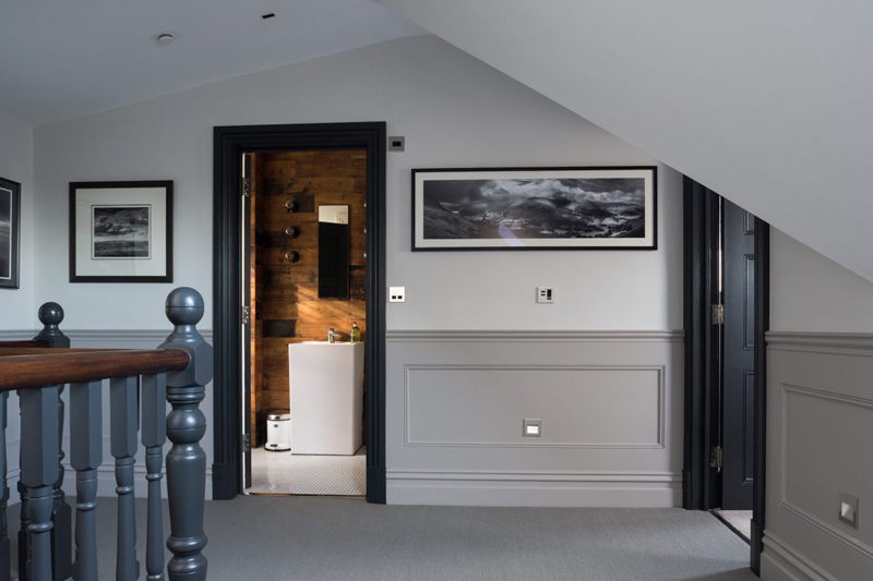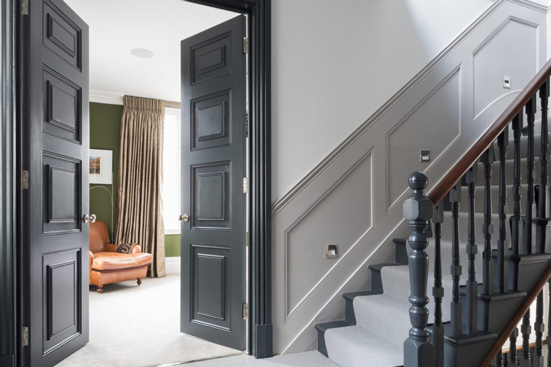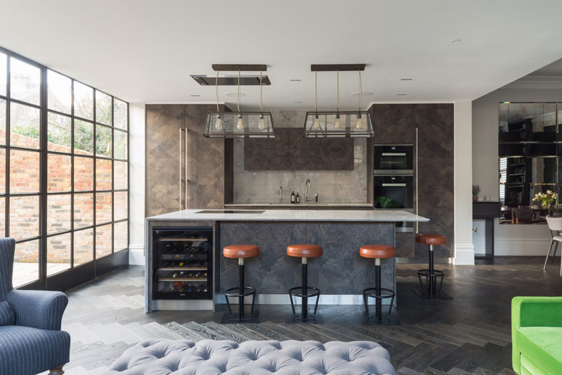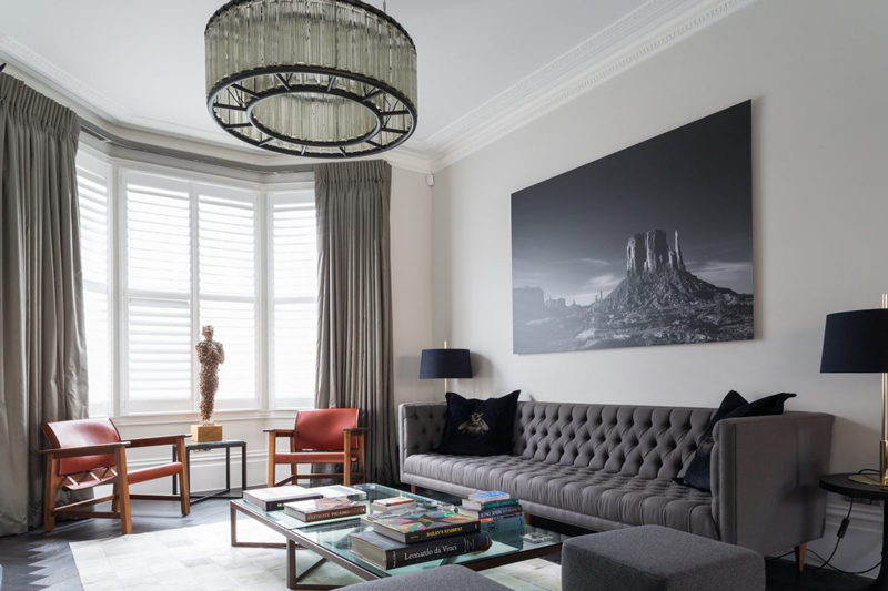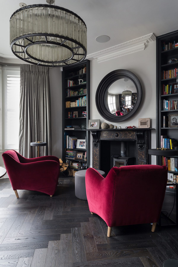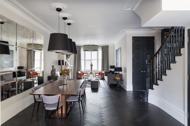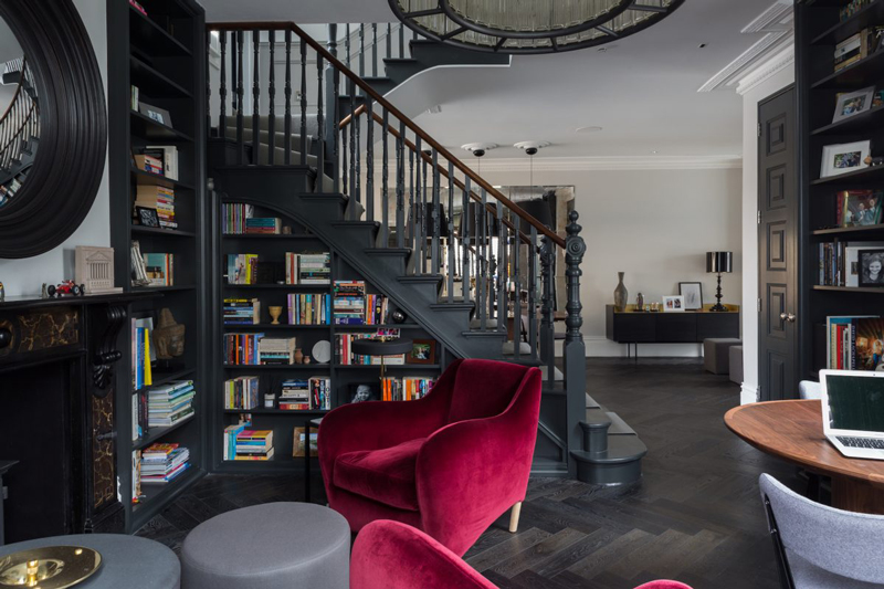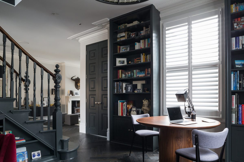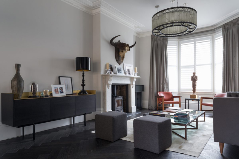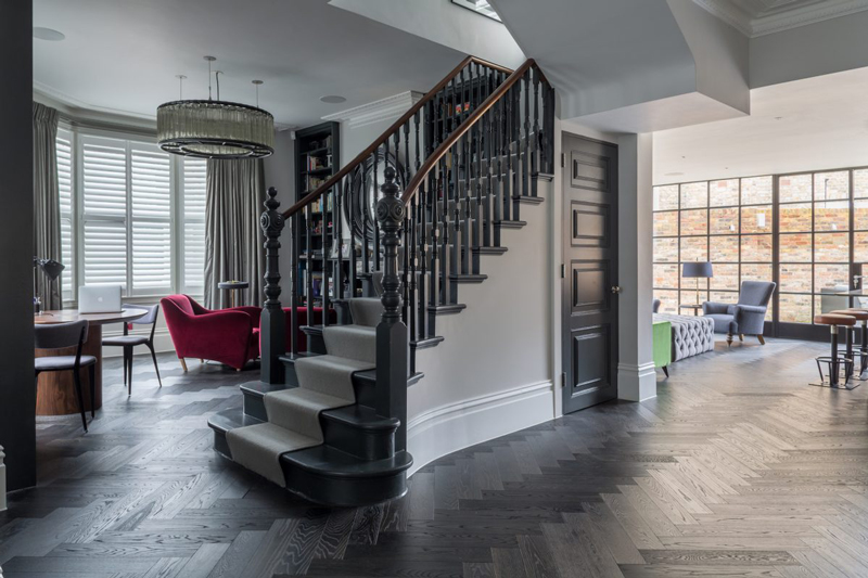 When old becomes new, and no expense appears to have been spared in the renovation of this semi-detached 4 story, 3,700 sq ft Victorian in Brixton, London. The dark grey stained herringbone hardwood floors are fantastic, and so much drama was added simply by painting the stairs, doors and their frames and some built-in bookcases black. This is classy yet liveable and significant attention to detail in the finishes. Glorious! Available as a location home through the one and only Shoot Factory.
