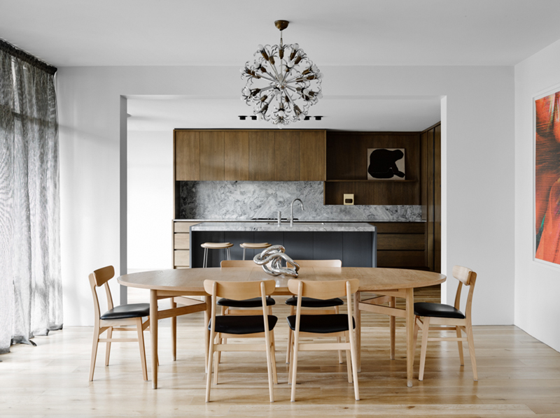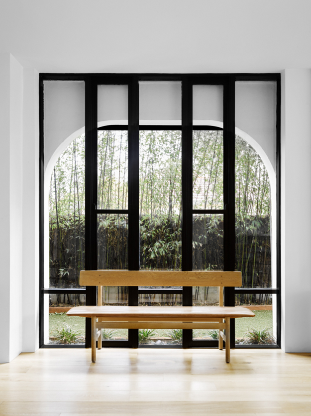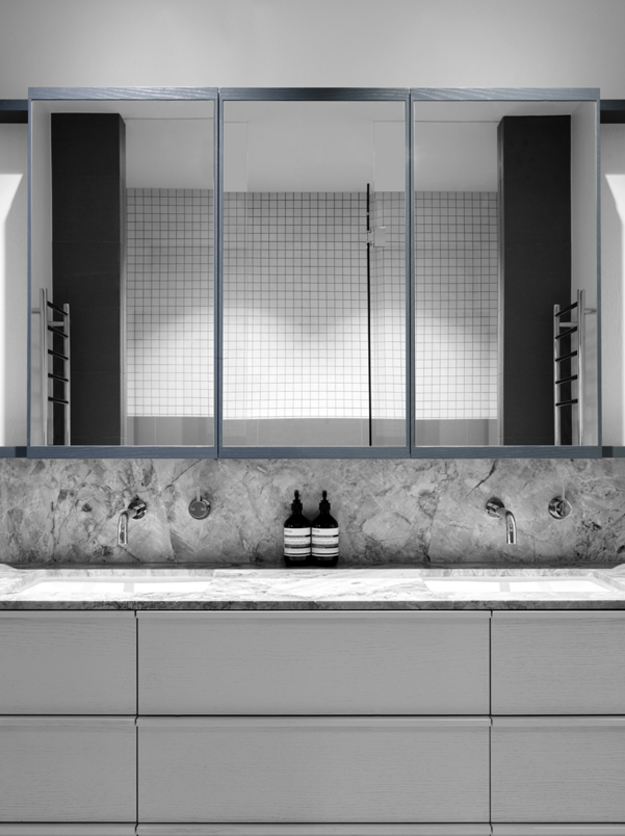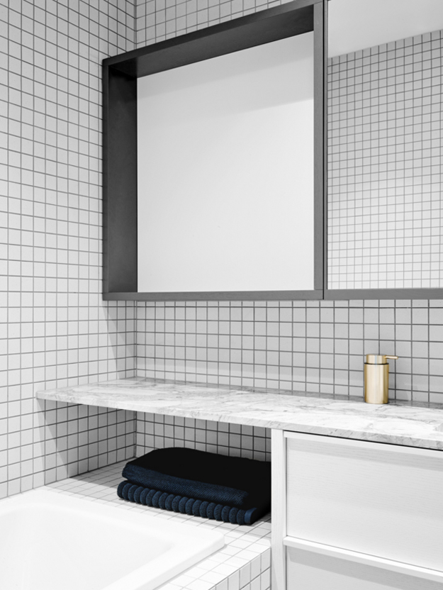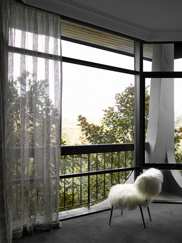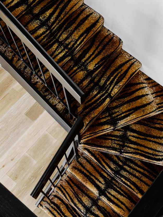 In this home renovation by Australian architecture firm Flack Studio, some original history is maintained while updating with some modern touches. And I love it. And the crazy stair carpet is explained: The charm of this house lies in its exceptionally cool architectural heritage. As a late 1960s build by Holgar + Holgar, nothing short of a contemporary redux of 1970s interior style would do it justice. Boldly black angular lines in the staircase and window frames juxtapose brilliantly against the original luxuriant curves of the building. Ultra slick, tightly grid-patterned bathroom tiling is a confident nod to the modernists’ geometric interests, while the original tiger print wool carpeting remains an incredible focal point of a modern family home that celebrates its pimping pad origins. (Photography: Brooke Holm, Art Direction: Marsha Golemac)