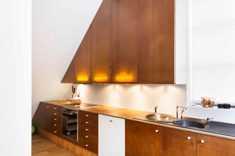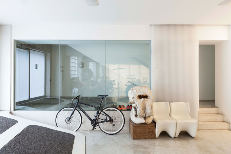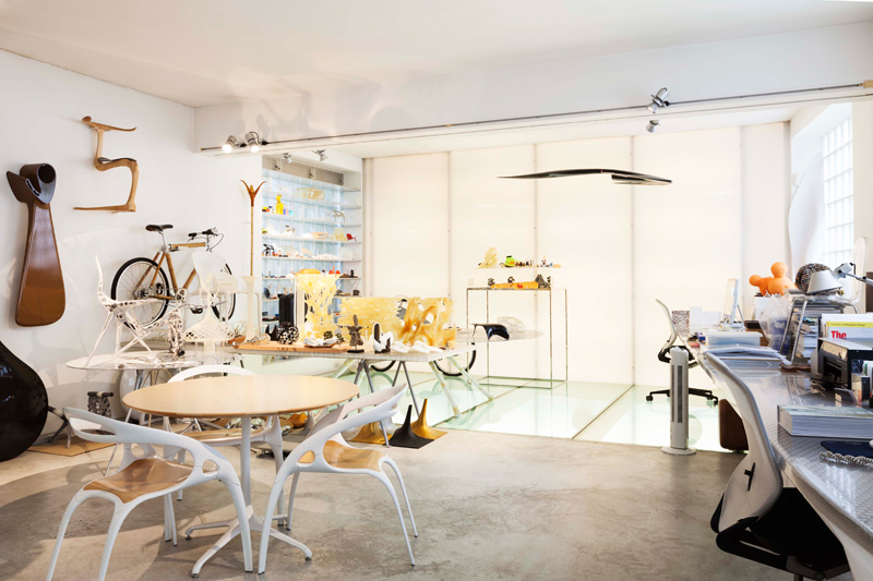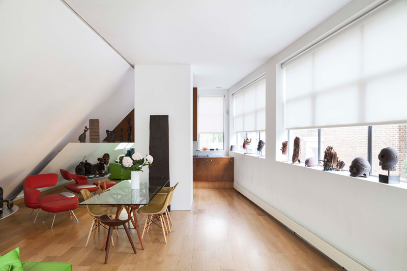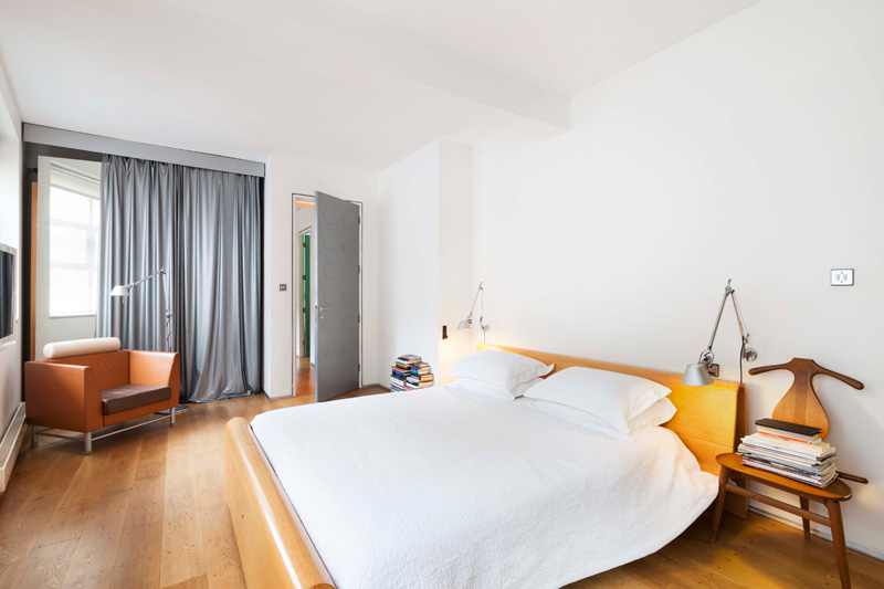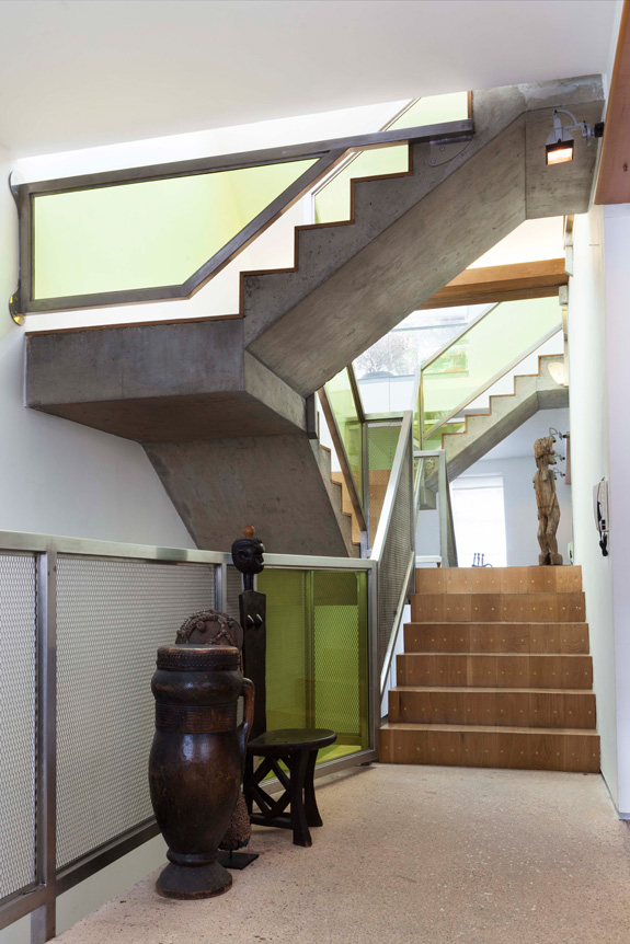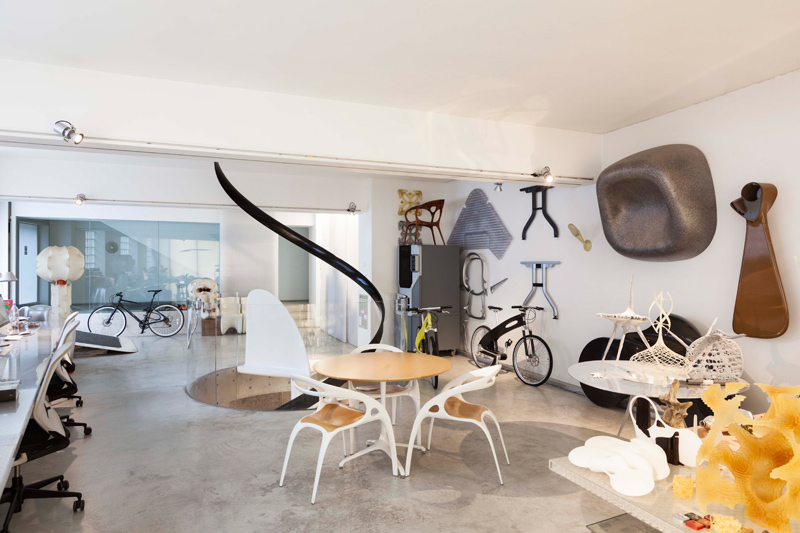 The 5,000 sq ft Notting Hill, London home and working studio of architect and product designer Ross Lovegrove is for sale via Domus Nova and all I can say is WHOA. I would prefer to call it a museum. This three storey former steel framed factory building, which was originally created by Richard Seifert and later reconfigured and extended by Miska Miller has played host to the creation of some of Ross Lovegrove’s most significant product designs and today remains a design archive of pieces that were created specifically for the property and have never been produced elsewhere. Central to the success of the redevelopment of this late 1950’s commercial building was the addition of the much feted ‘DNA Staircase’. Locating workspaces on the ground floor to allow for direct access from the street, the upper floors were designed to follow the principles of upside down living, with the bedrooms and study areas on the central floor and the entire top of the building given over to one 30m living and dining areas. Elsewhere, integral details such as the kitchen cabinetry, which was created from honeycombed fibreglass aircraft flooring, the carbon fibre sinks in the bathrooms and the huge 2.5m sliding doors on each room will remain in the building as a testament to Miller and Lovegrove and their love of utilitarian design.