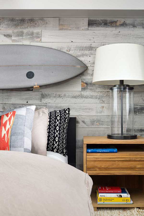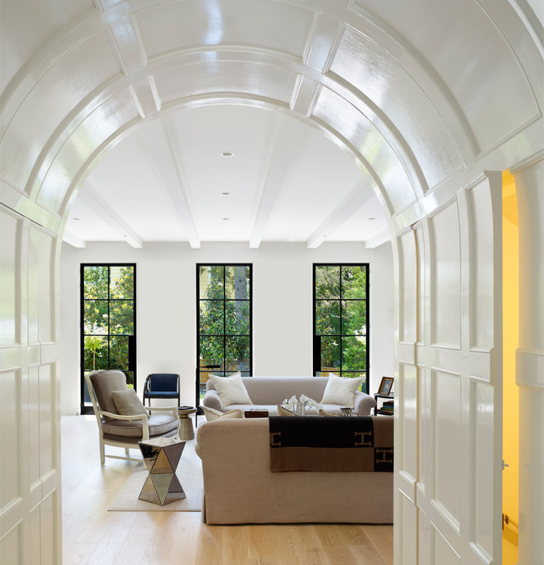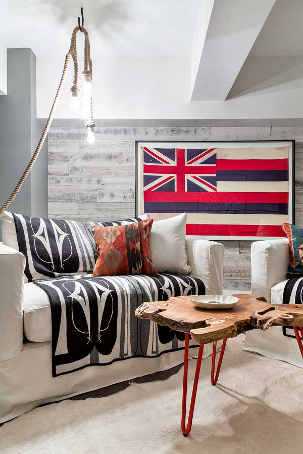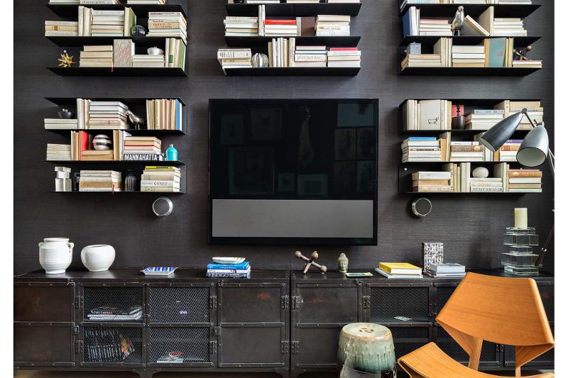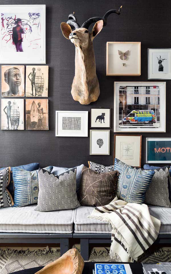 There’s so much to like about this space. The drama of a narrow, tall room. The dark grasscloth walls. The bookshelves around the TV. The long comfy couch stuffed with softly karate chopped ethnic textile cushions. The French hang. That rug. Those plants in the window.The sophisticated euro modern meets tribal meets industrial mid century with taxidermy overkill. Culture Clash, a NY bachelor pad by Workshop/APD.