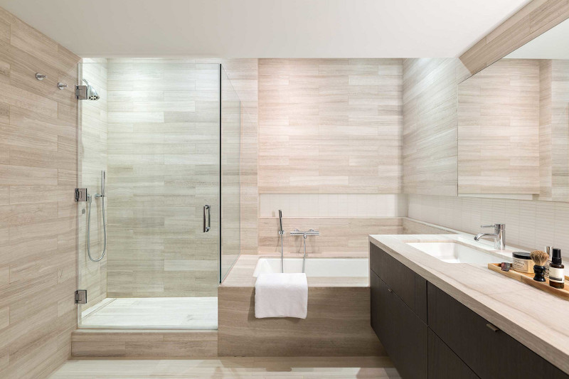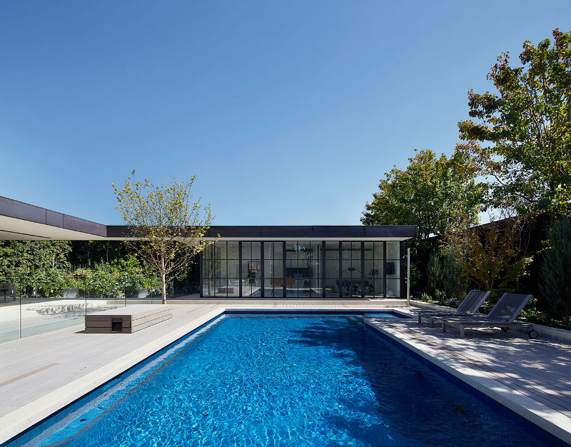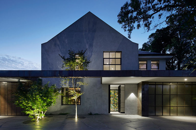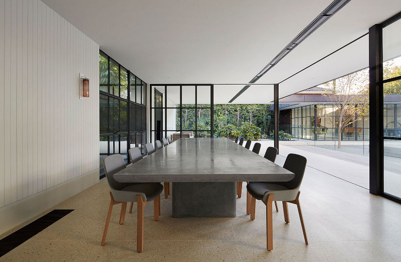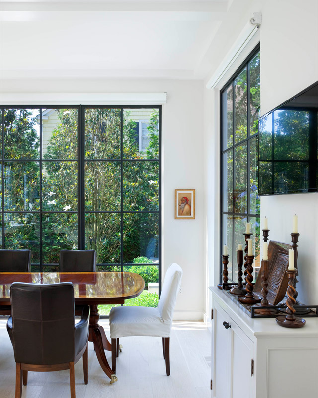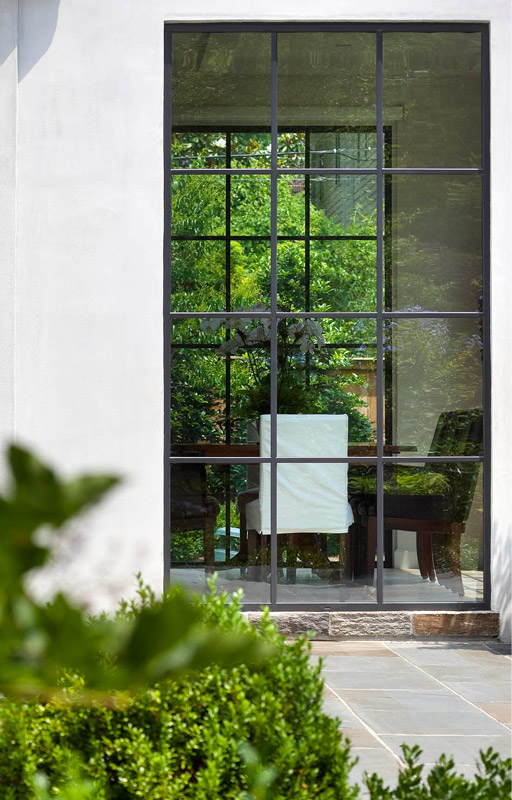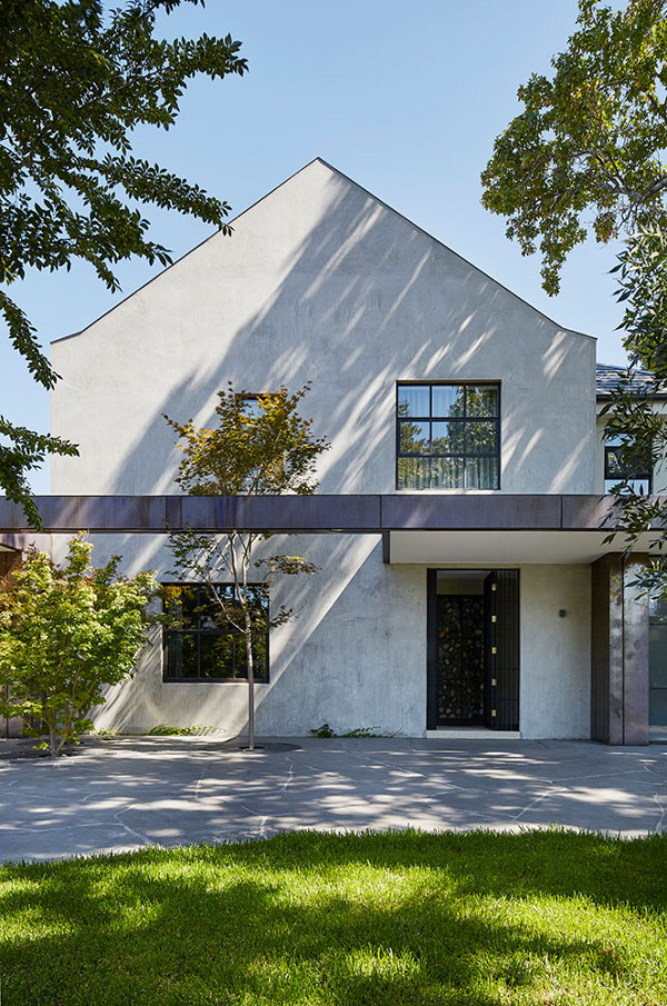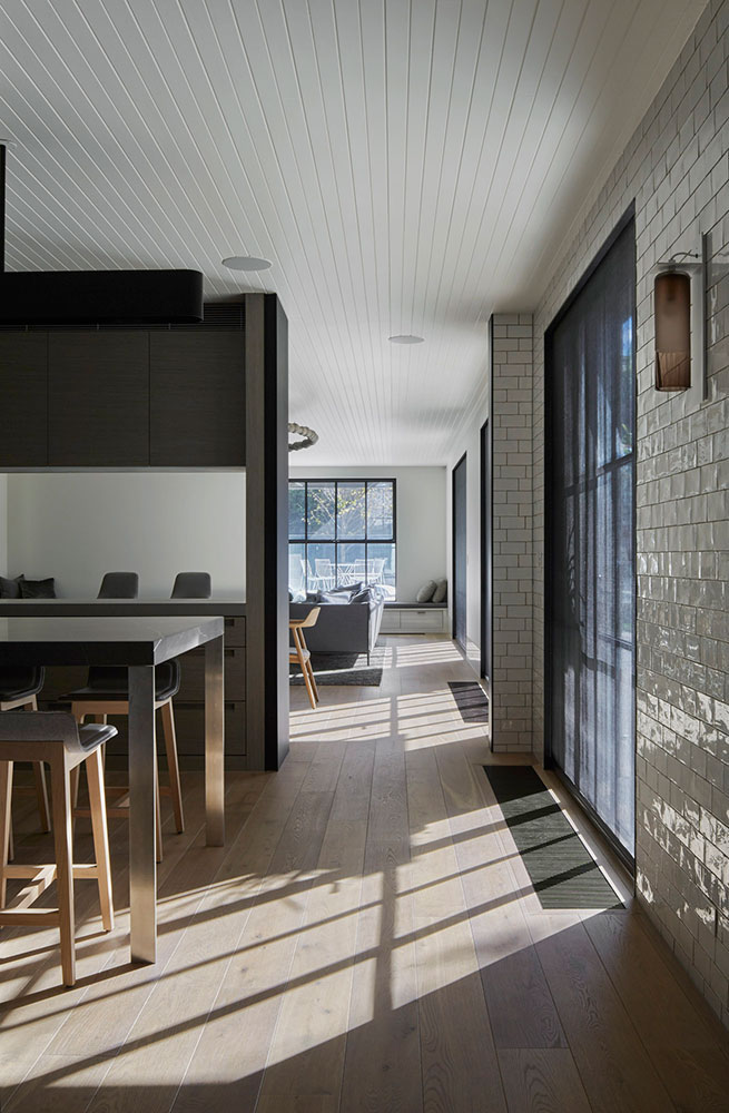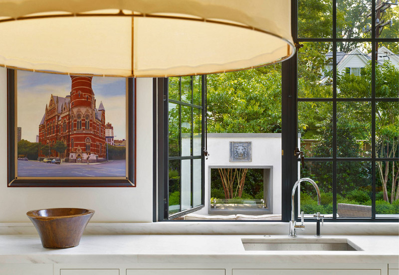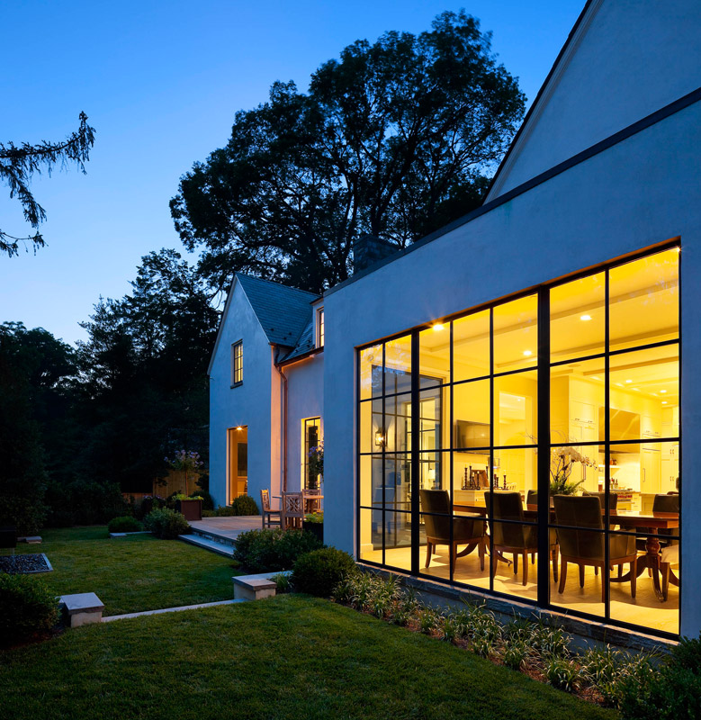 “Located in the Edgemoor neighborhood in Bethesda, Maryland, this new home draws influence from the Bauhaus movement. Clean crisp spaces with oversized steel doors and windows pull the outside in to create spaces filled with light and warmth.”