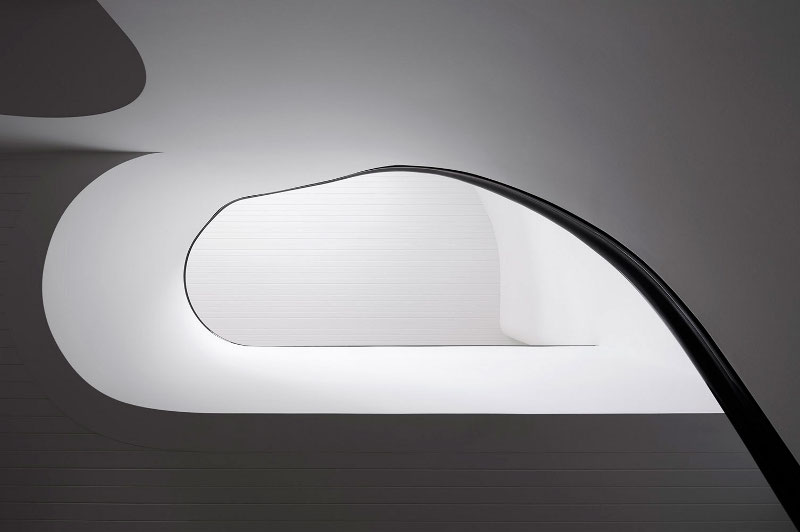 Anyone else notice my growing fascination with staircases? Particularly ones that sweep and turn, ones with sinuous shape. A new favourite appears simple at first but look up. Yes you need the function but enjoy the form. By b.e architecture.