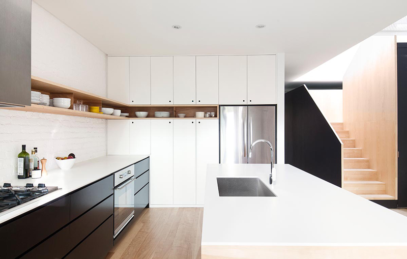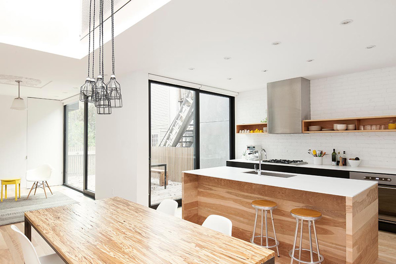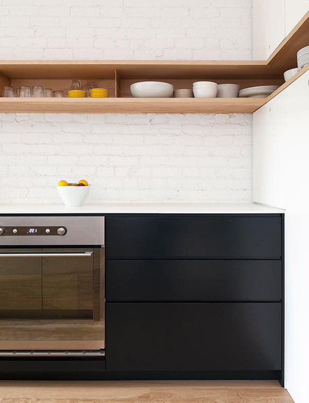 I love everything about this kitchen. The white painted brick wall, the matte black lower cabinets with white countertop (I despise my black quartz counters – I would totally swap for this combo), the display shelving running along the top instead of uppers and how they cut into the wall of cabinetry, the island blending into the floor….it’s incredible. The only thing I would have maybe done was hang some simple lighting over the island. Another successful project by la SHED.