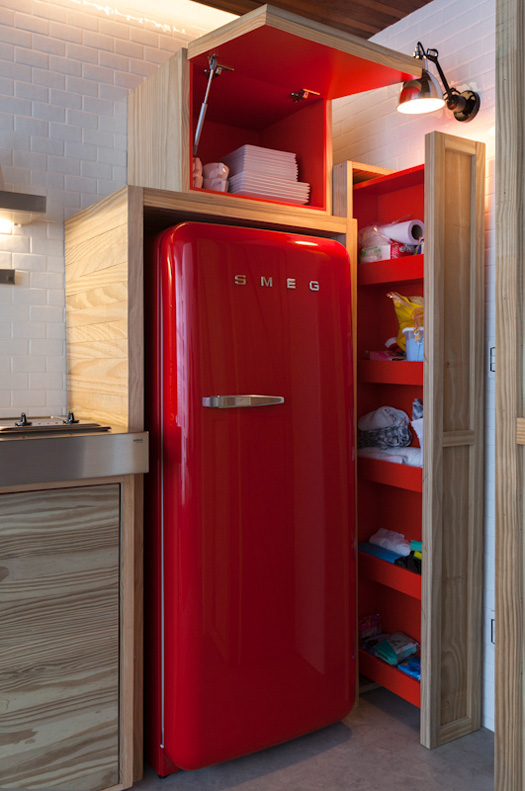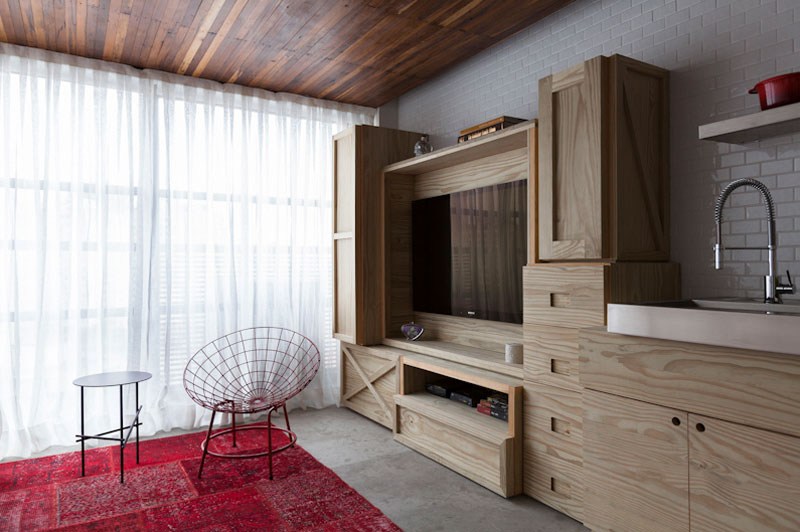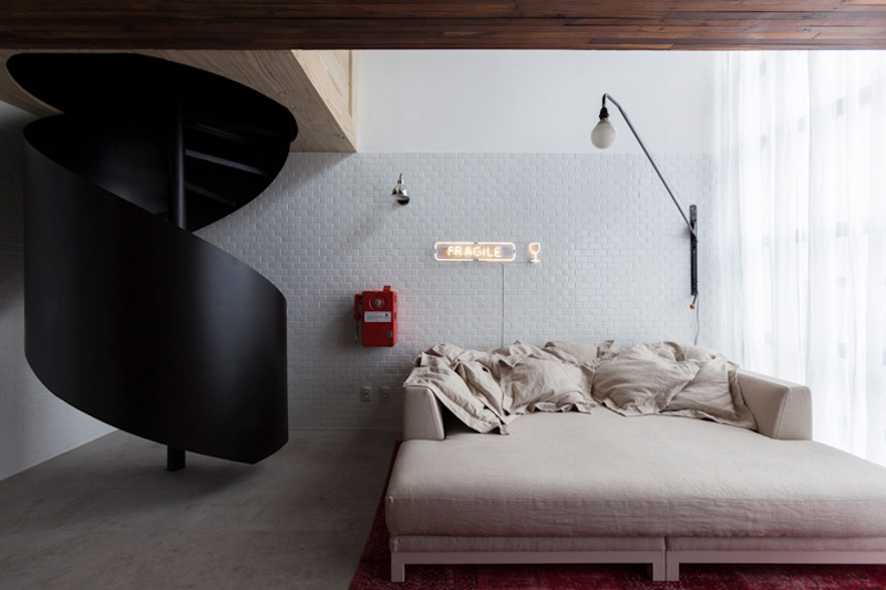 I found this compact São Paulo apartment designed by Brazilian architect Alan Chu and had to share. It’s got micro square footage but Alan made such great use of limited space. A single wall was converted into storage for both the kitchen and living room, which kept the majority of those spaces free for basic furnishings. I think he and the owner like subway tiles. 🙂 The spiral staircase is compact and a gorgeous architectural feature. Overall, a really cool space. (Via Casa Vogue Brasil)