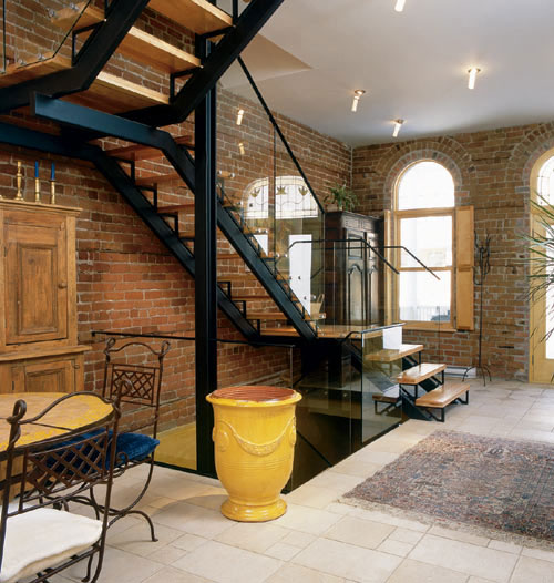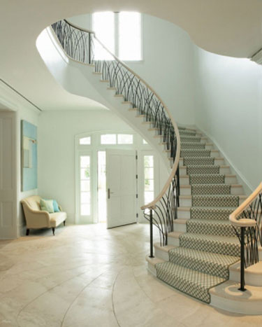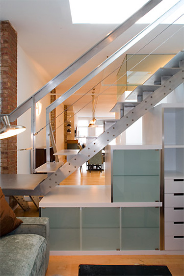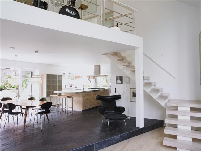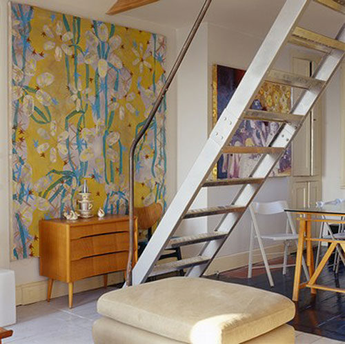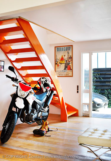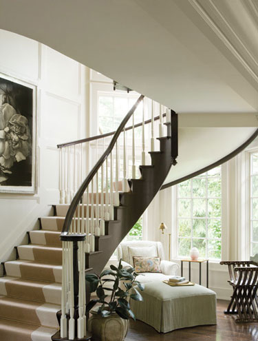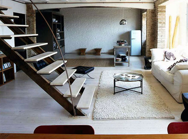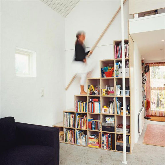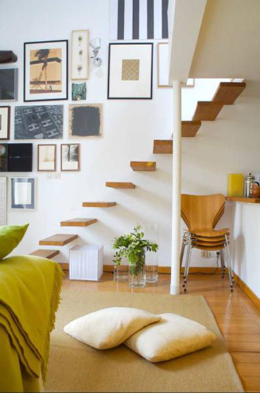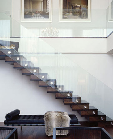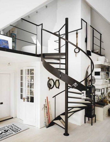 Today’s reader request comes from Anna of from bali with love: “I have a question maybe you and your readers can help me with. I plan to renovate a one story house to a two story house. The front door/main floor opens into the living area (rectangular shape). I’m thinking the living space is the best place to add the staircase to go to the second level but I’m having a hard time deciding what type of stairs to use and a good location for them? By the front window/door? Along the long wall on right side of room? etc? Ideas, pictures, advice and suggestions would be greatly appreciated!” My initial thought is to place the stairs by the front window/door. That way all that stuff that will take up space will be in one location and the rest of the space will be free. I went digging through my photo stash and found all sorts of ideas that may help – although I didn’t find too many photos that clearly showed stairs situated in a living room. But I think these will help….and thank gawd stairs aren’t quite as boring as they used to be!