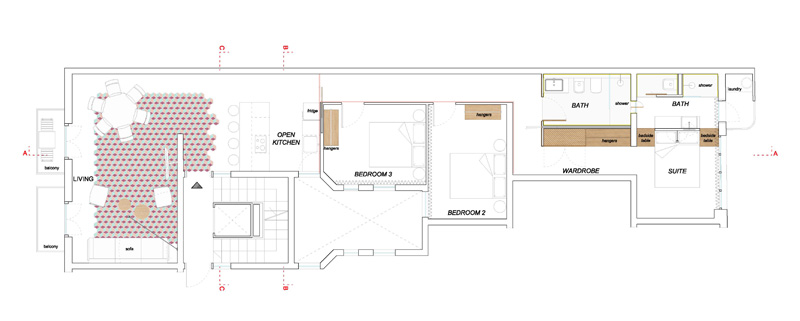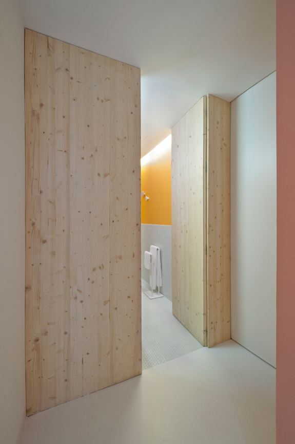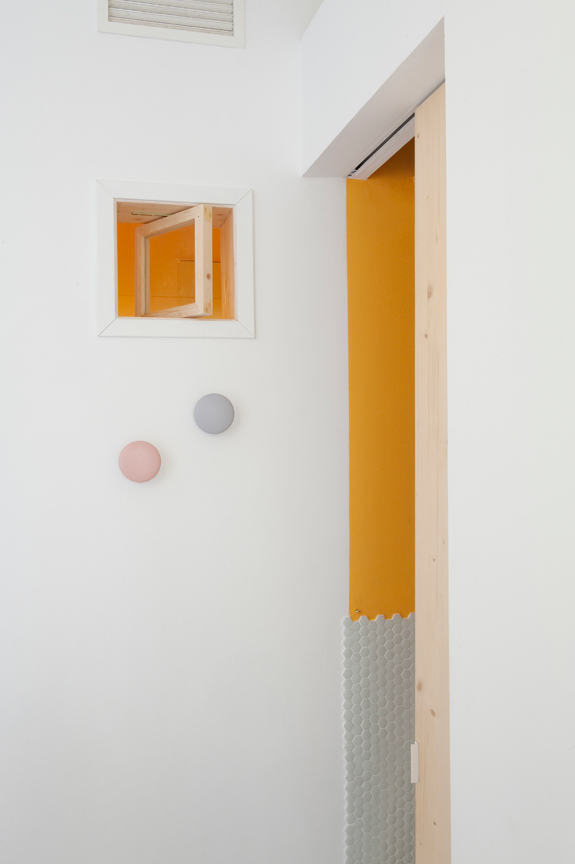 It’s fun. It’s young. It’s fresh. With a base formula of white walls, exposed brick and wooden floors Polish design firm Widawscy Studio Architektury have created a home full of colour and pattern. The living areas wrap around a central core that houses a powder room and the stairs that rise to the sleeping areas. Strong geometric pattern in wallpaper and tiles packs a design punch while coloured glass in the ensuite bathroom adds rich colour to the otherwise simple white master bedroom.