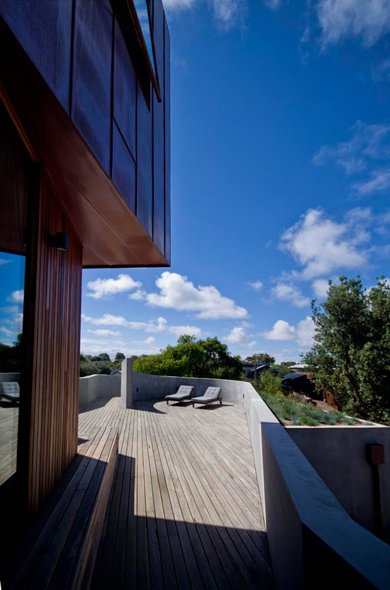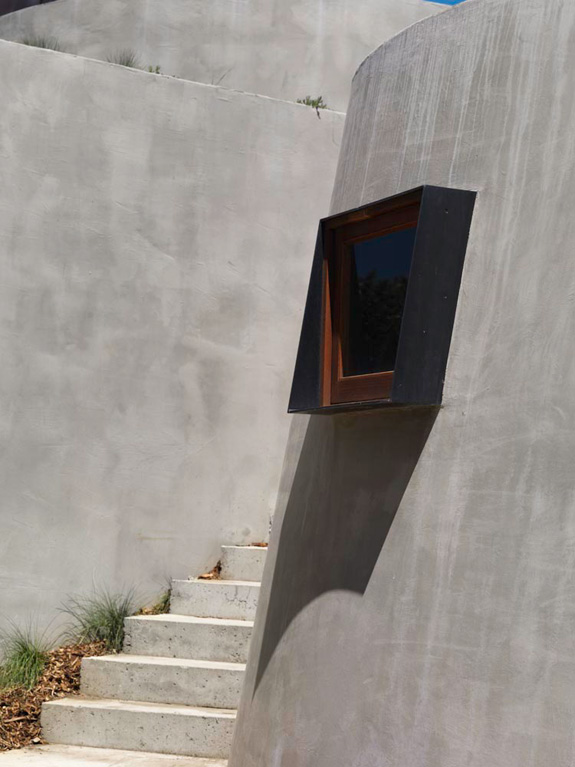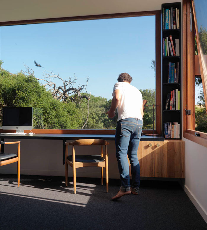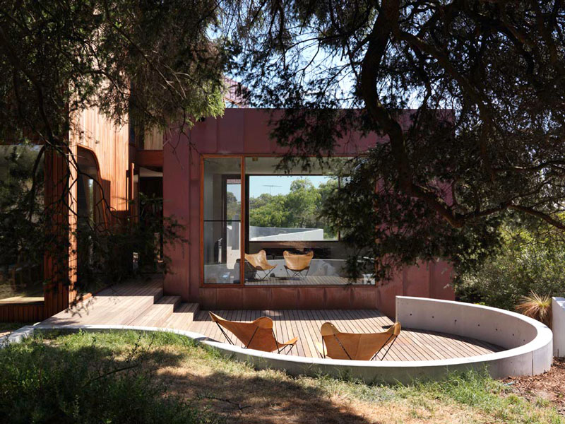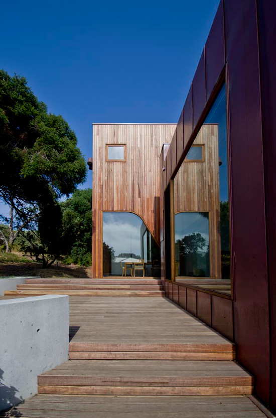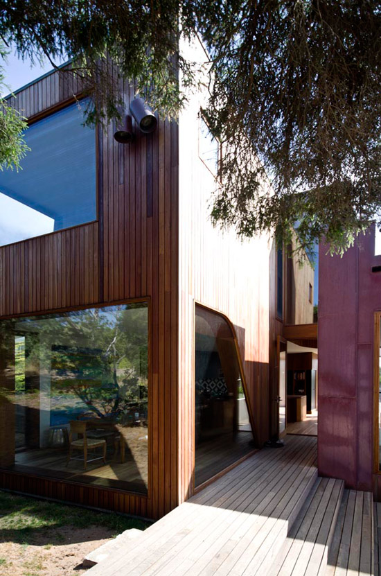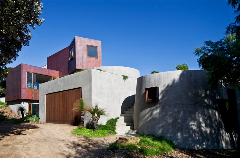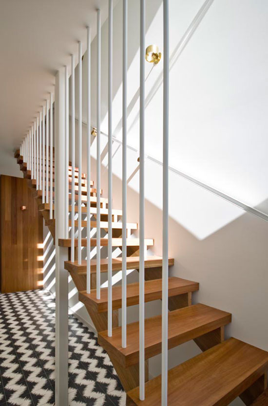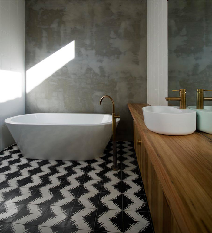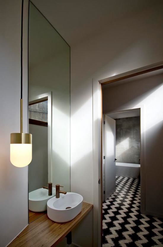 Check out this quirky home build by Australian architects Auhaus. Quirky on the outside anyway, with its layout of pod-like structures. The interior on the other hand is SWEET! The kitchen and bathroom are gorgeous and that tile – WOW! Nothing like a little graphic pattern to keep things interesting. (Jo featured Auhaus before – here and here).