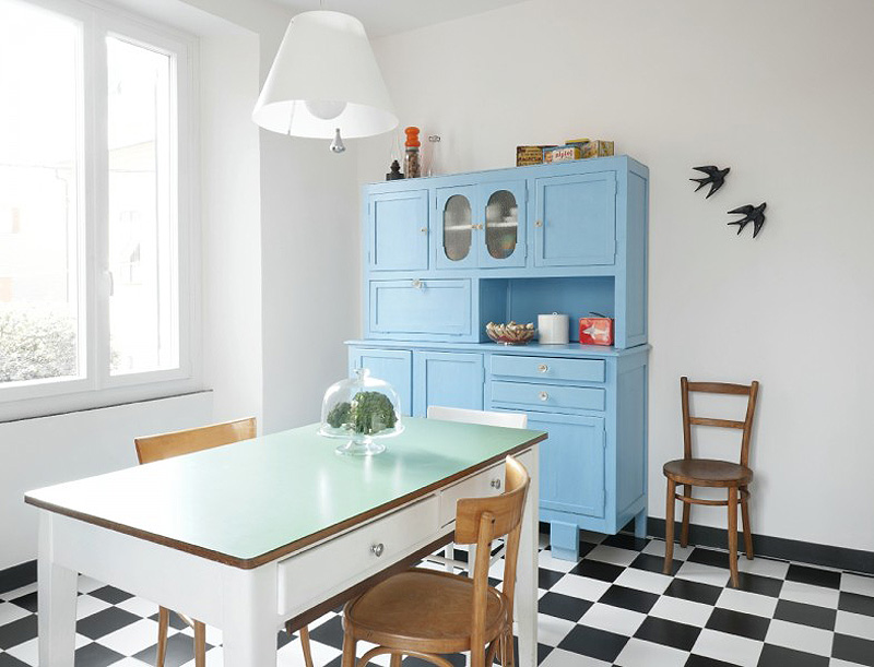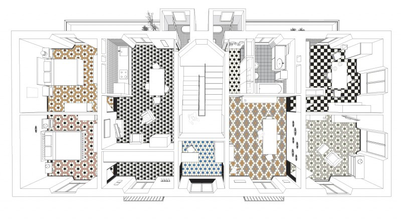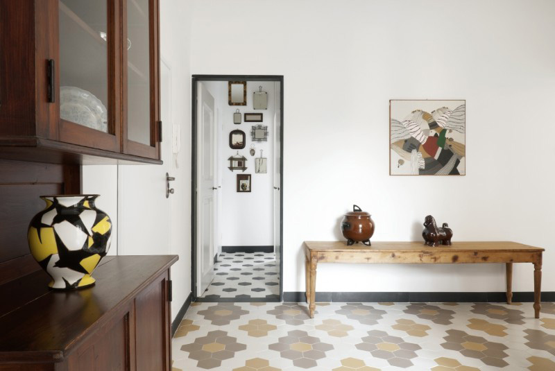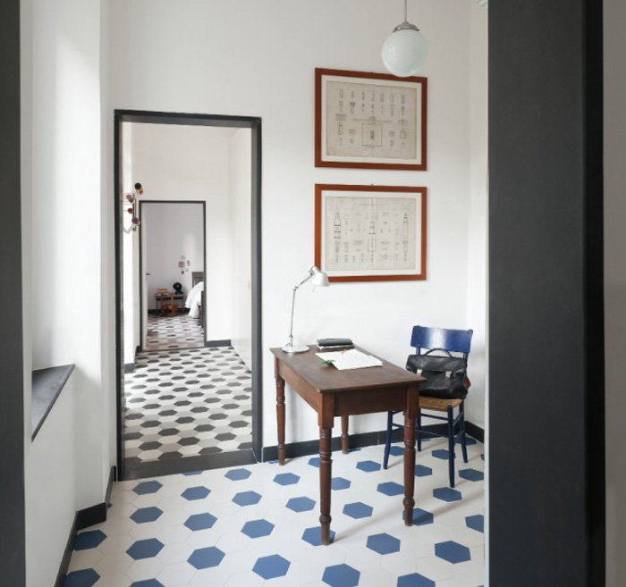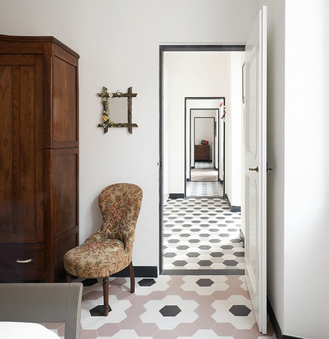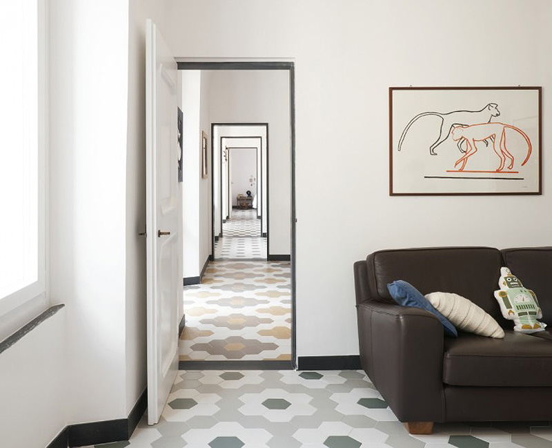 I fell in love with this adorable apartment when I stumbled across it while doing some creative googling. It is located on one floor of a renovated home built in 1870 in Savona, Italy. It was designed by architecture firm Grooppo and while there is not much to it, they were geniuses to add some interest (whilst it seems to be lacking elsewhere) via a different tile floor in every room. How fun!!!