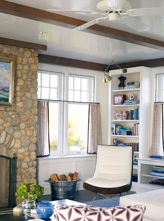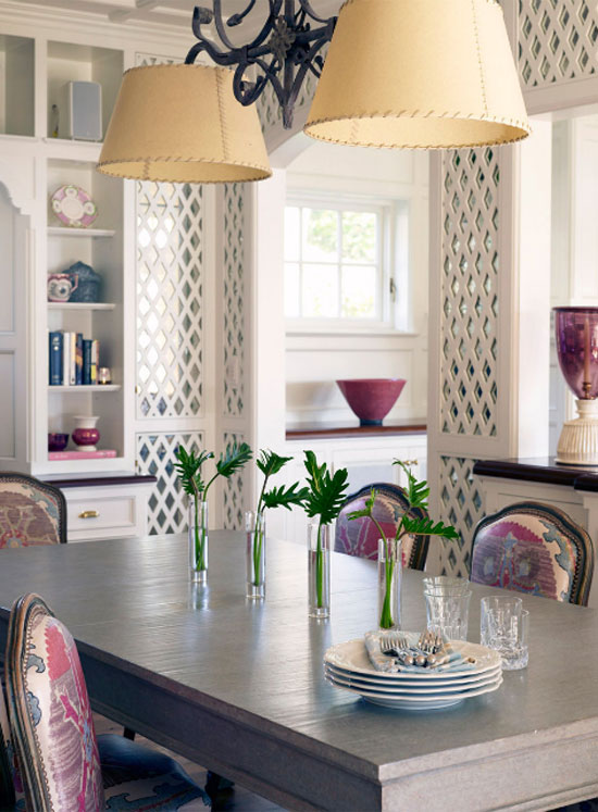 Layers of colour and pattern are expertly combined with texture and styles. Modern meets vintage and traditional. Floral flirts with geometric and colours are at one time clean and cool and at another warm and earthy. Silk sits with sisal and wool washes across vintage vinyl. Pillows are plumped with down and strewn here and there are piles of books and simple floral arrangements. Casually elegance imbued with comfort. Sink into a sofa and relax. Beautiful homes by Boston based Hudson Interiors.