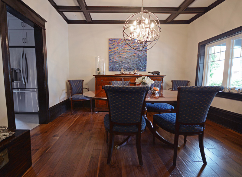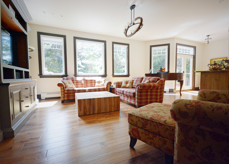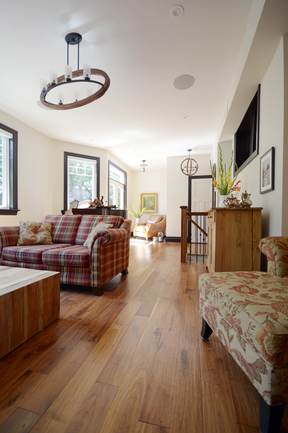 The family room is located at the back of the house and is part of the large 4 story addition the homeowners added during the renovations. It is bright and spacious enough to fit their grand piano.