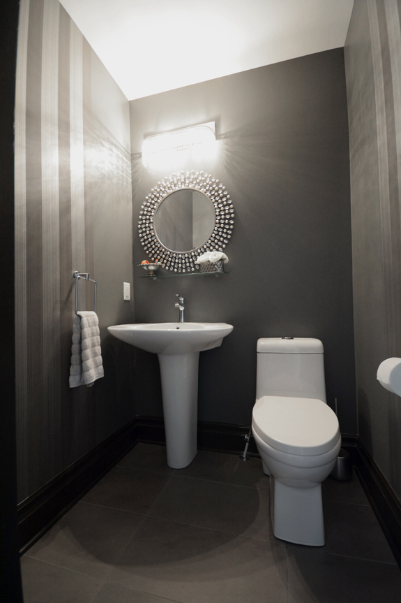 Loving the tiny dramatic powder room just off of the family room. The perfect space to do something unexpected.
