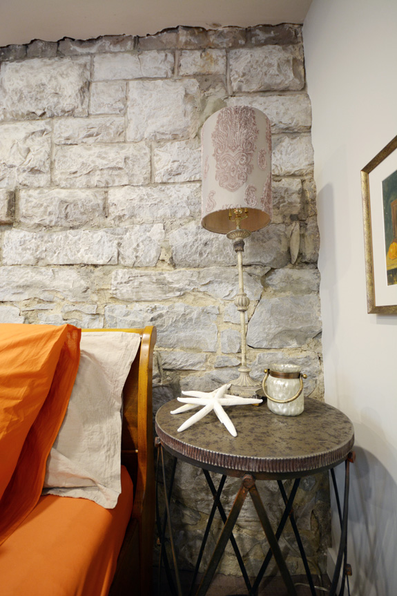 The wall behind the bed is the original stone foundation that they left exposed. Love that!